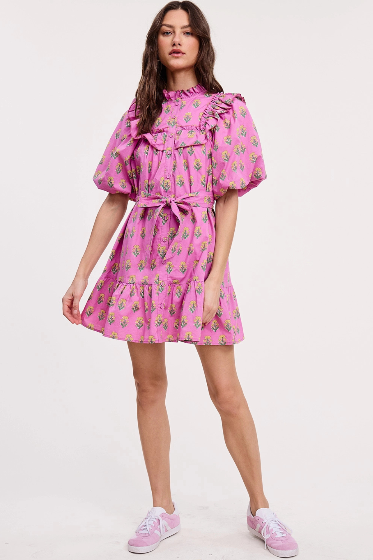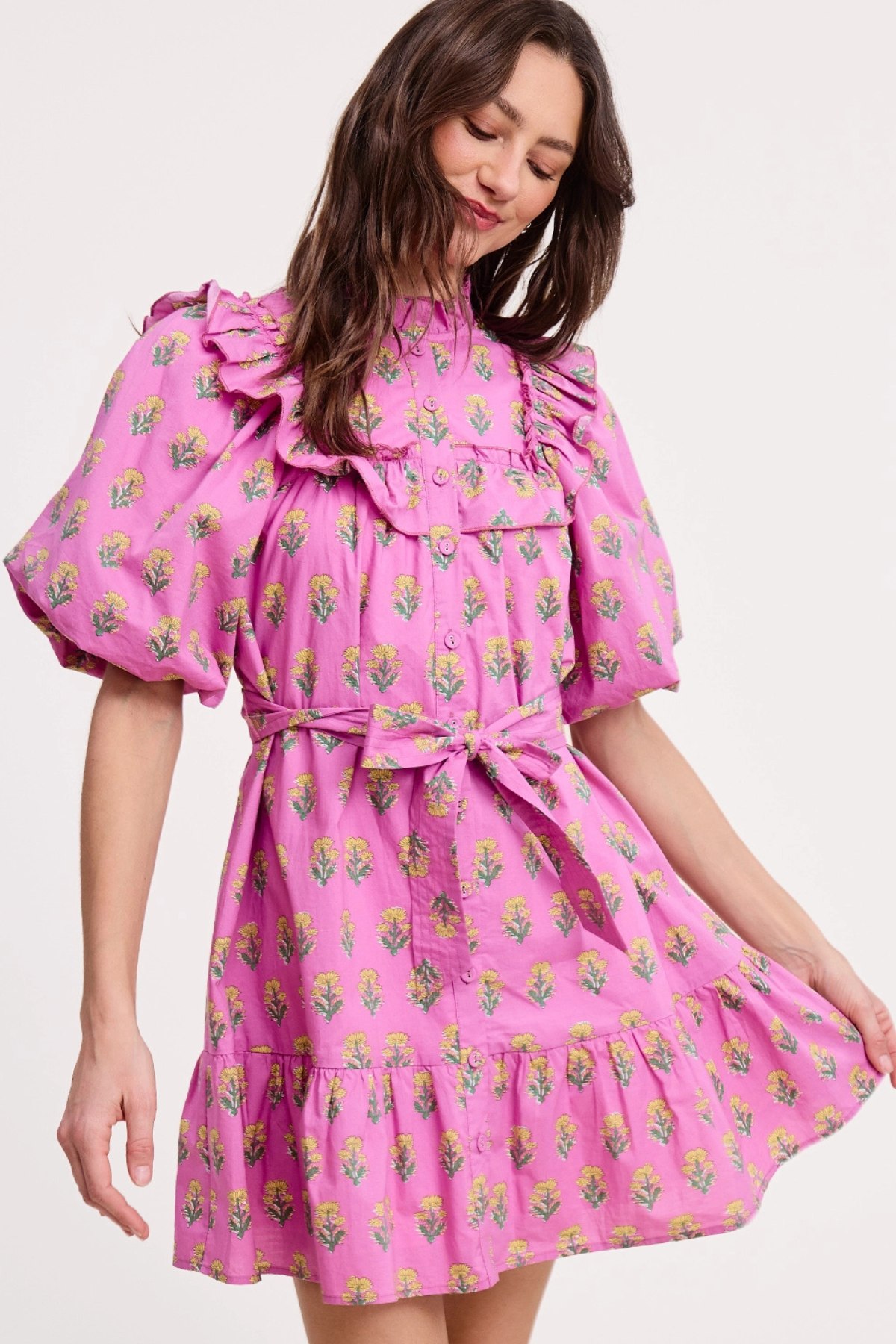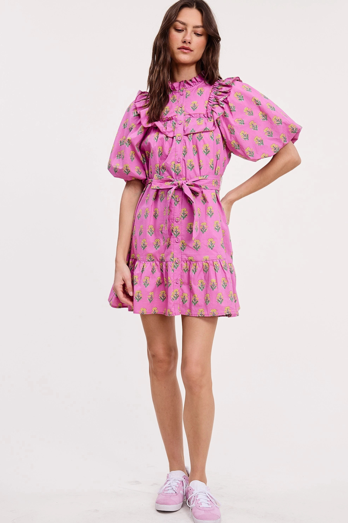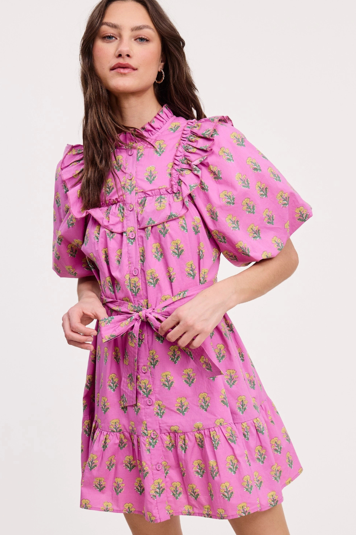 This charming shirt dress brings a playful twist to effortless summer style. Crafted from soft, breathable cotton, it features a tiered silhouette that moves beautifully with you. Ruffle details along the bodice and sleeves add a romantic, feminine touch, while the button-down front and self-tie waist offer a flattering, relaxed fit.