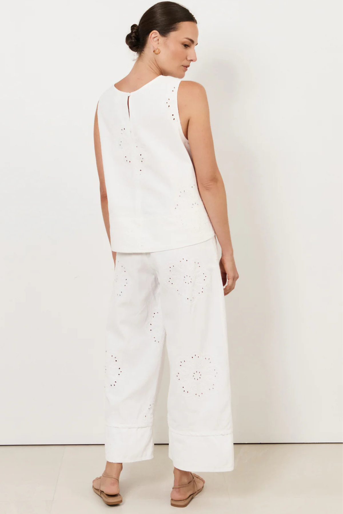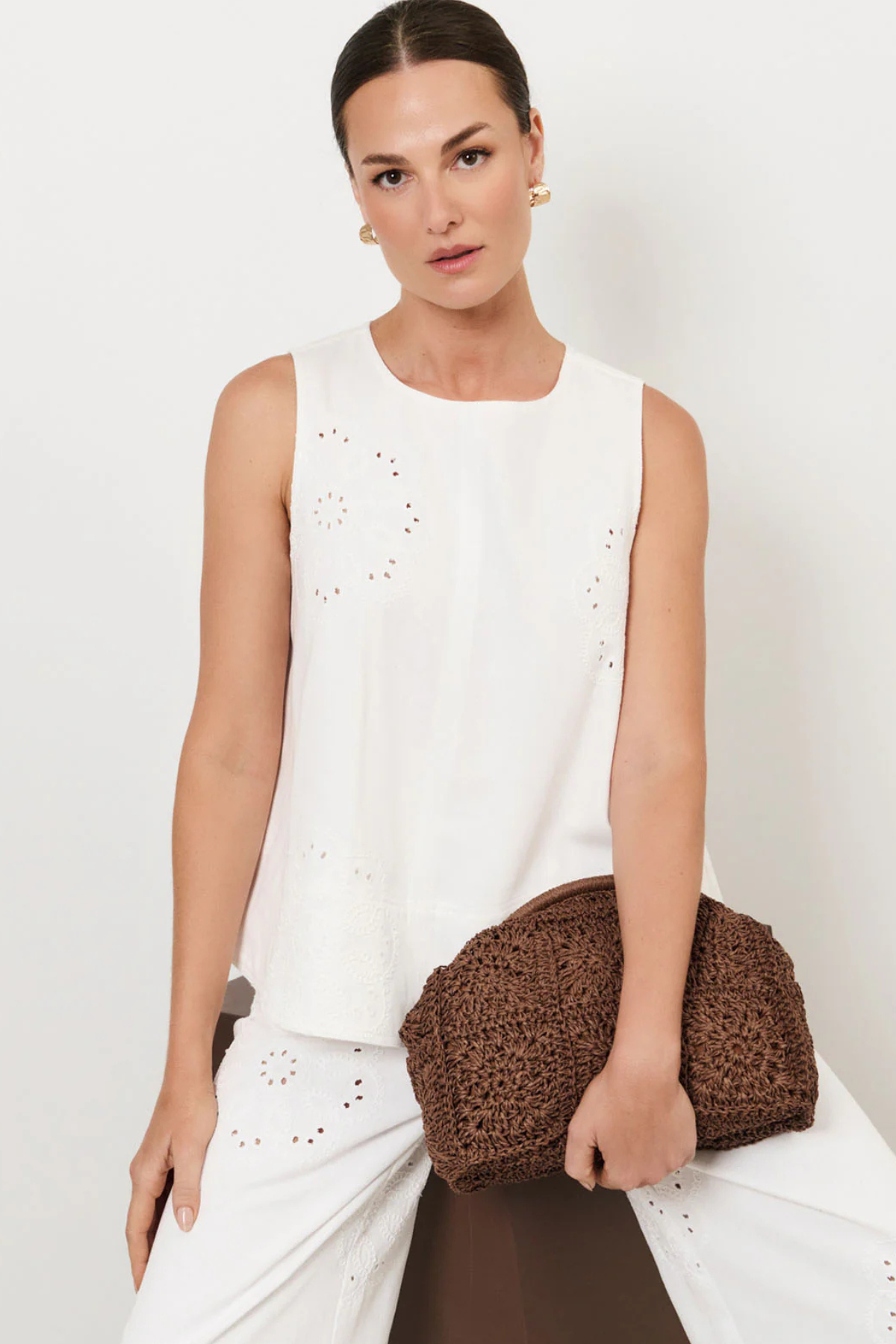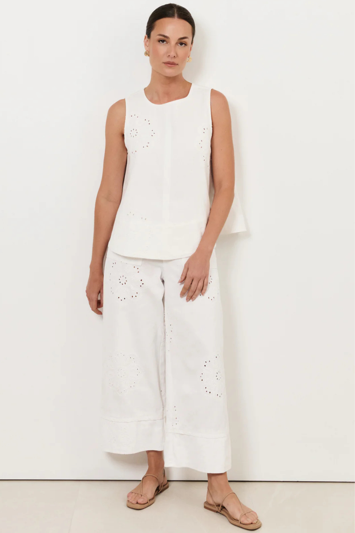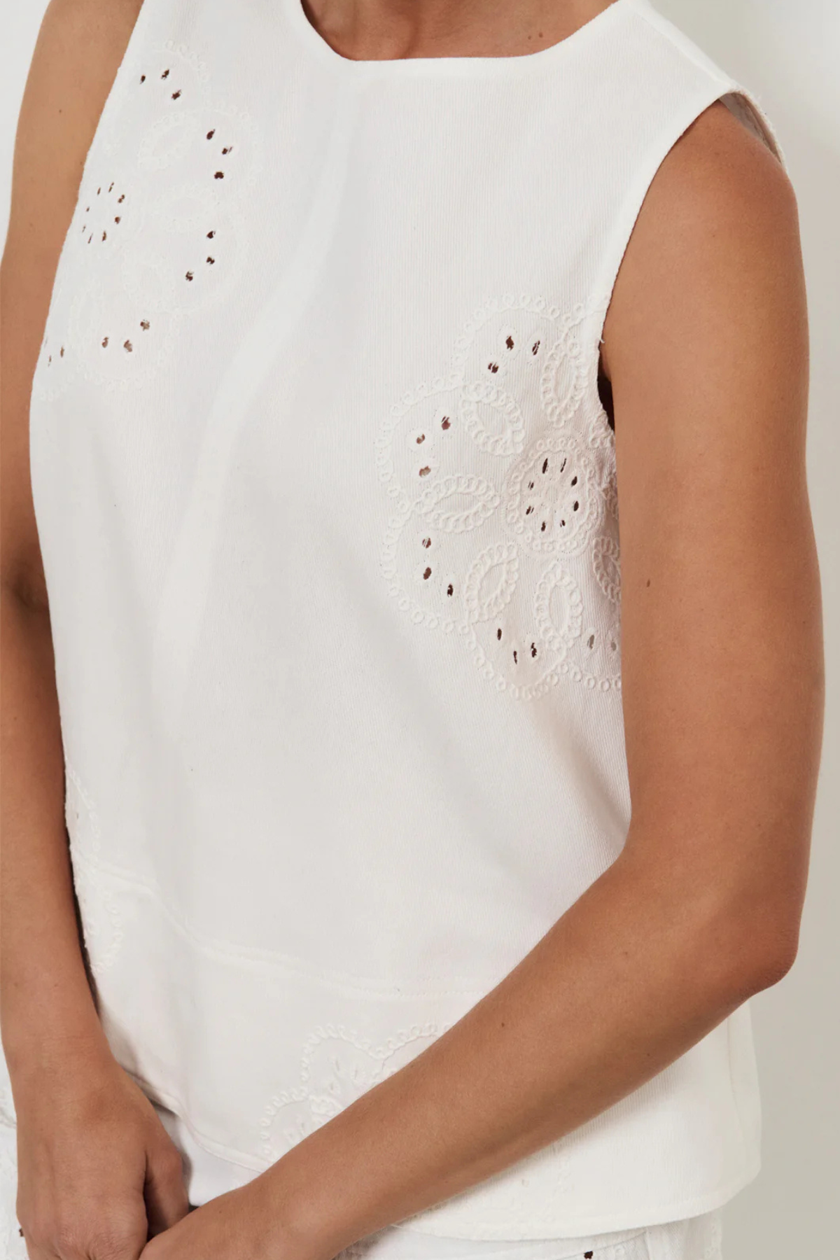 The Dillon Embroidered A-Line Top in White features embroidered floral motifs and contrast stitching. Designed with a round neckline and a relaxed A-line silhouette, this piece is finished with a wide hem and a button-and-loop back closure.