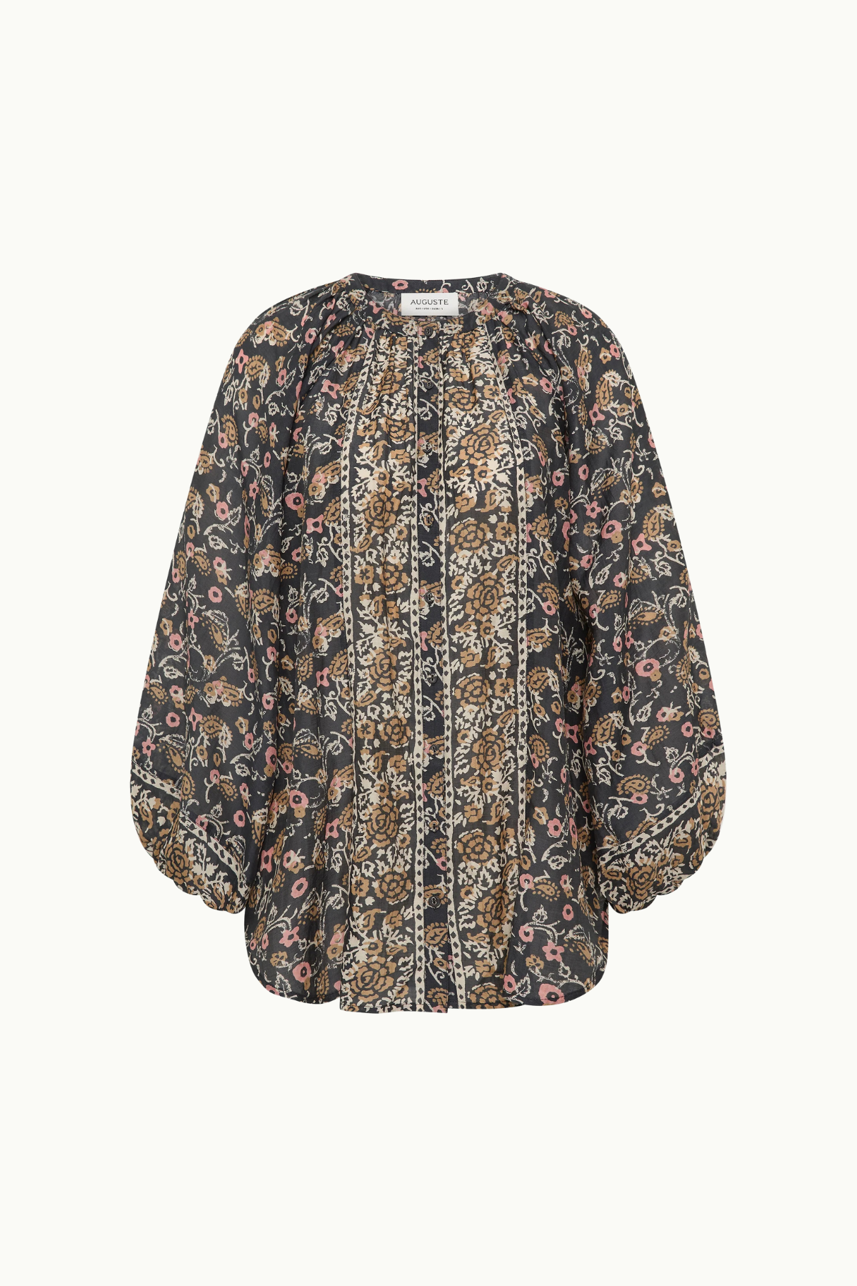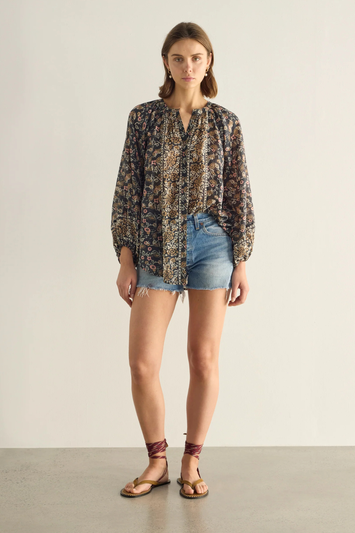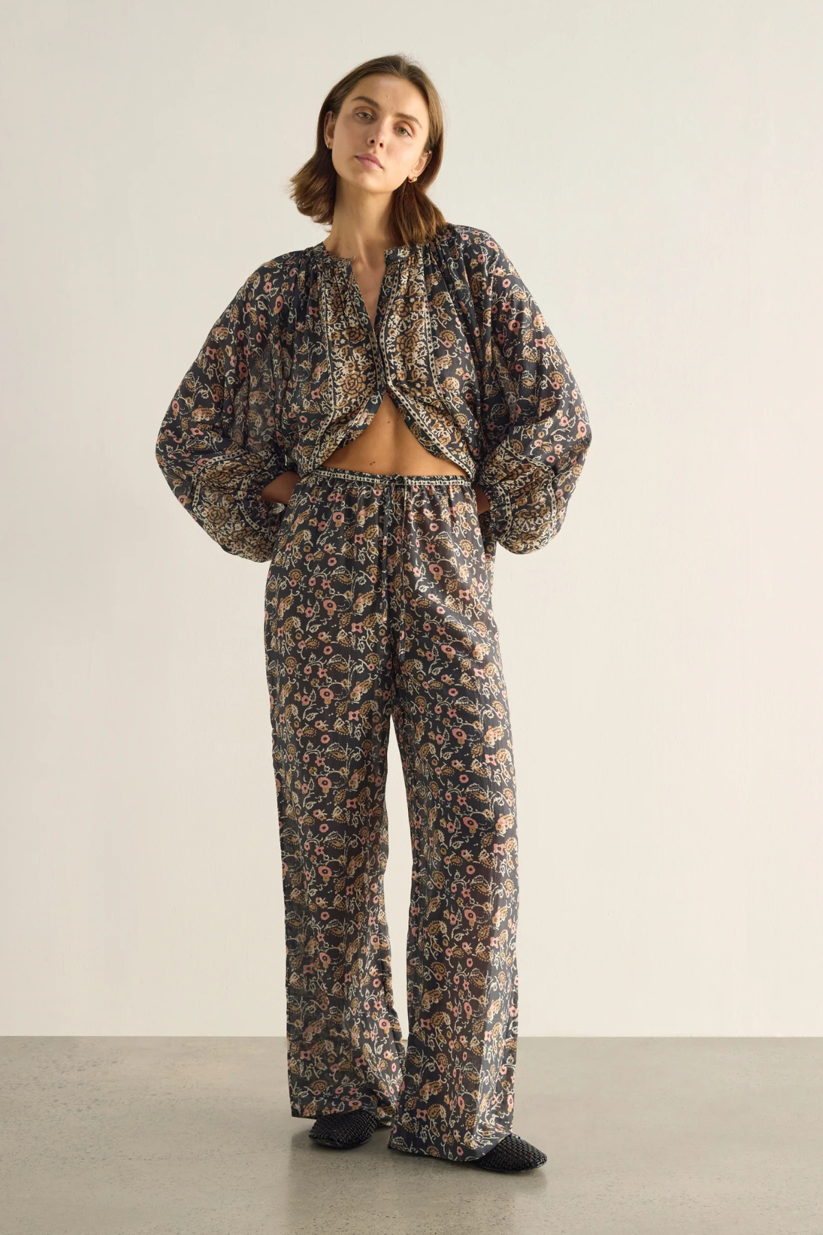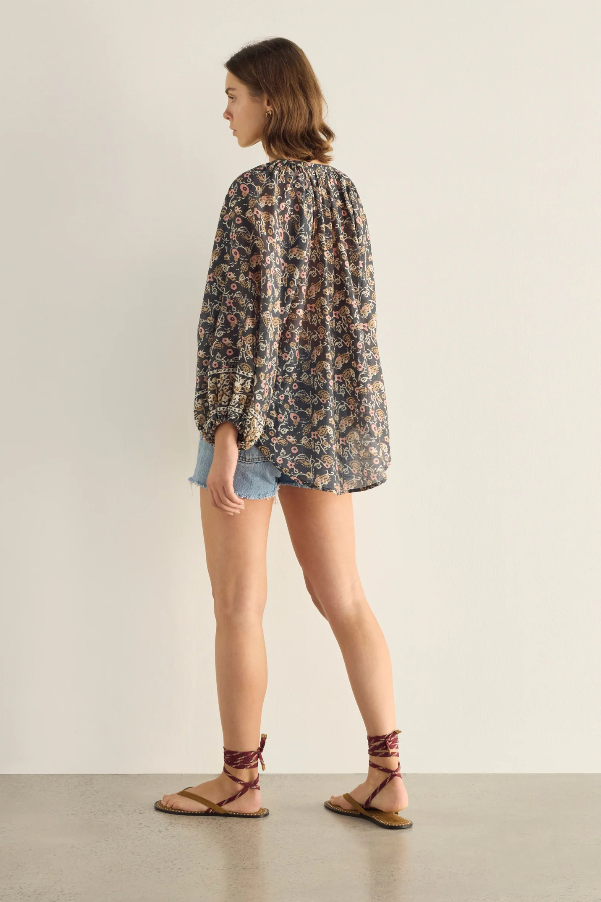 The Hayley Blouse in our striking charcoal Sonder print is crafted from airy, luxurious cotton–silk voile with beautifully placed border detailing. Designed with a refined mandarin collar and raglan voluminous sleeves, it drapes in a relaxed silhouette you’ll float through summer in. Style with your favourite denim or pair with the matching Martha Pants for set perfection.