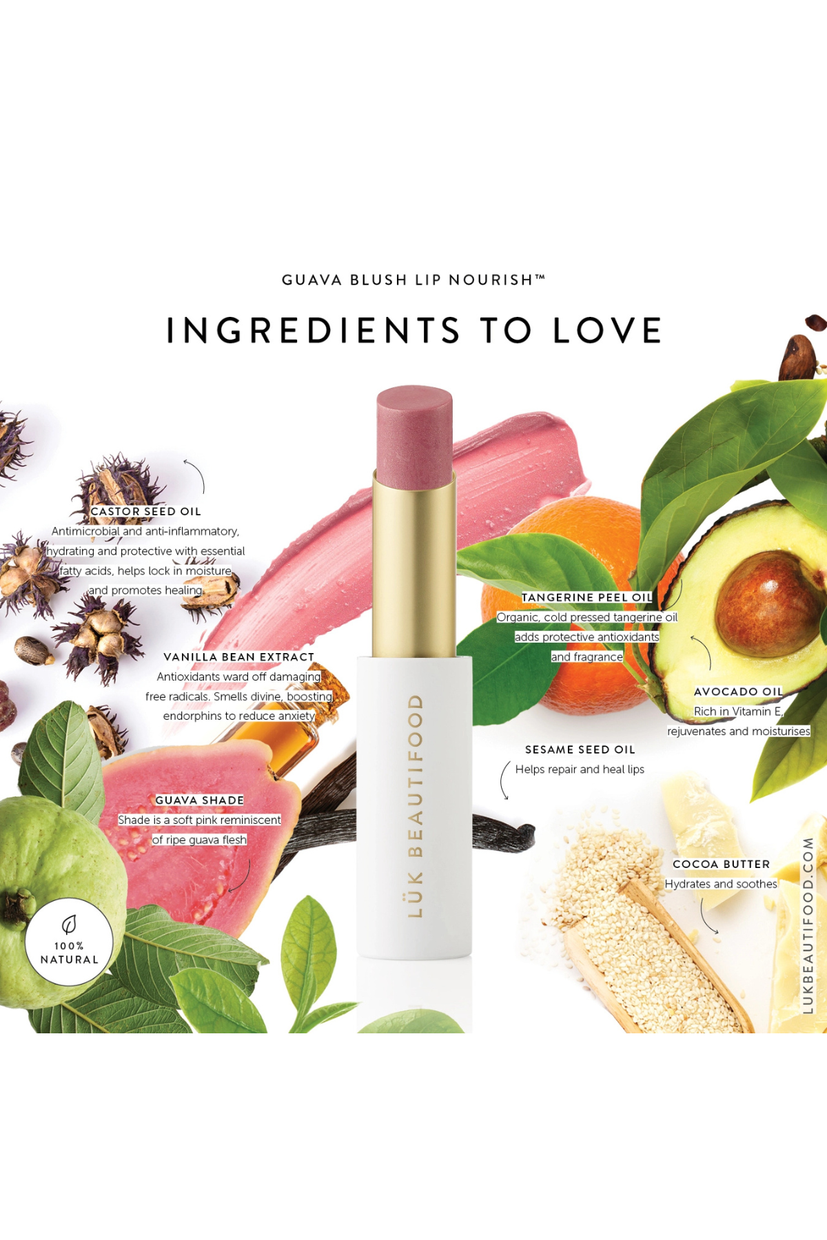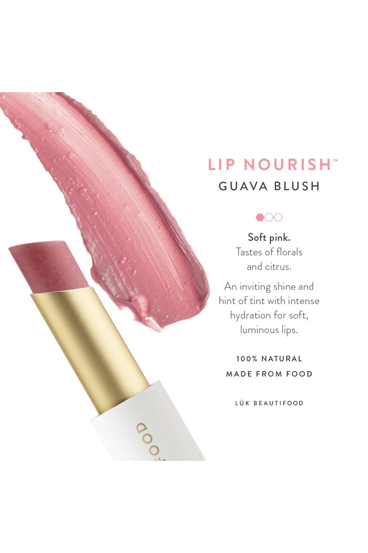 Its soft guava-pink tone comes from natural mineral oxides, edible carmine and food-grade pigments crafted to flatter a wide range of complexions.