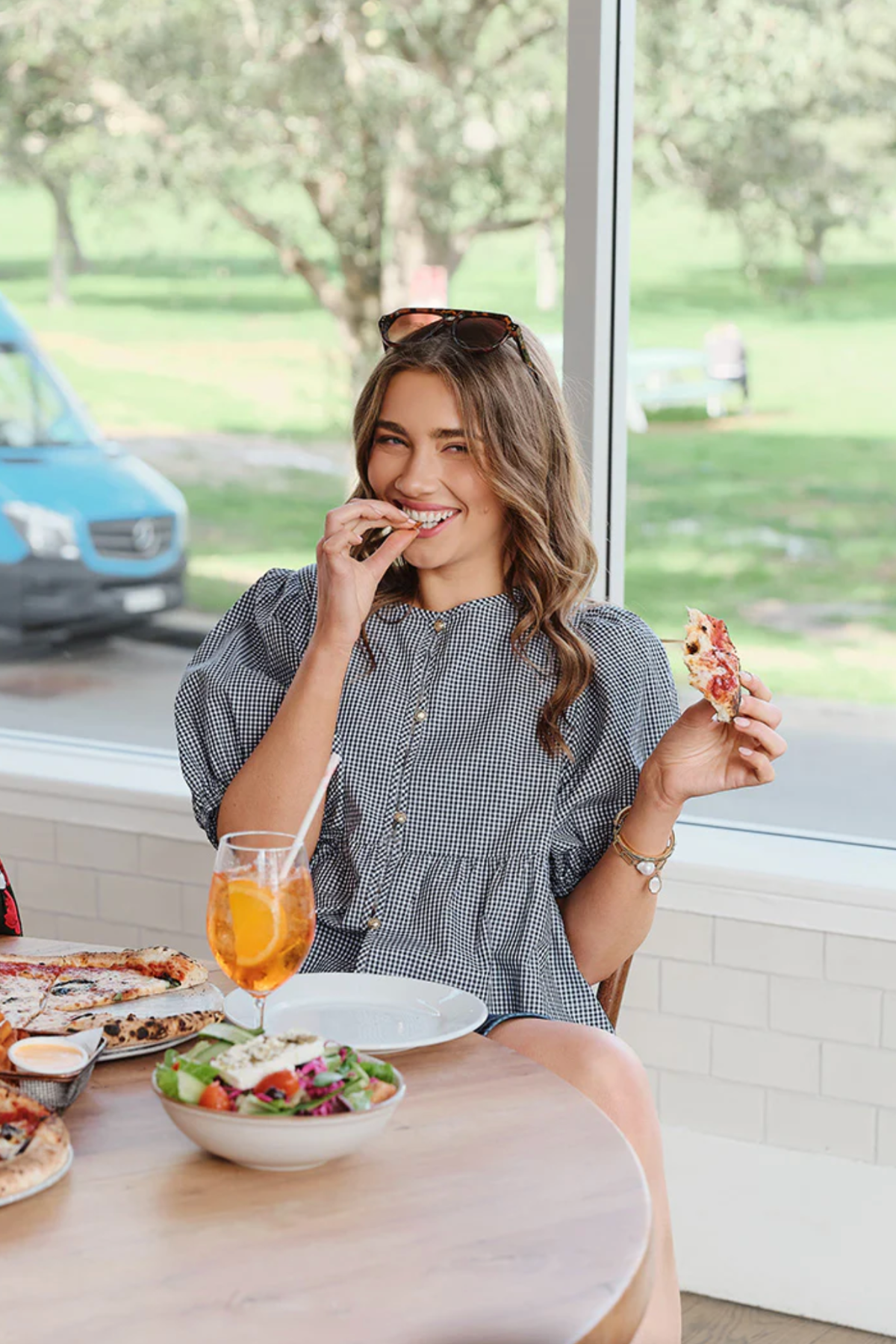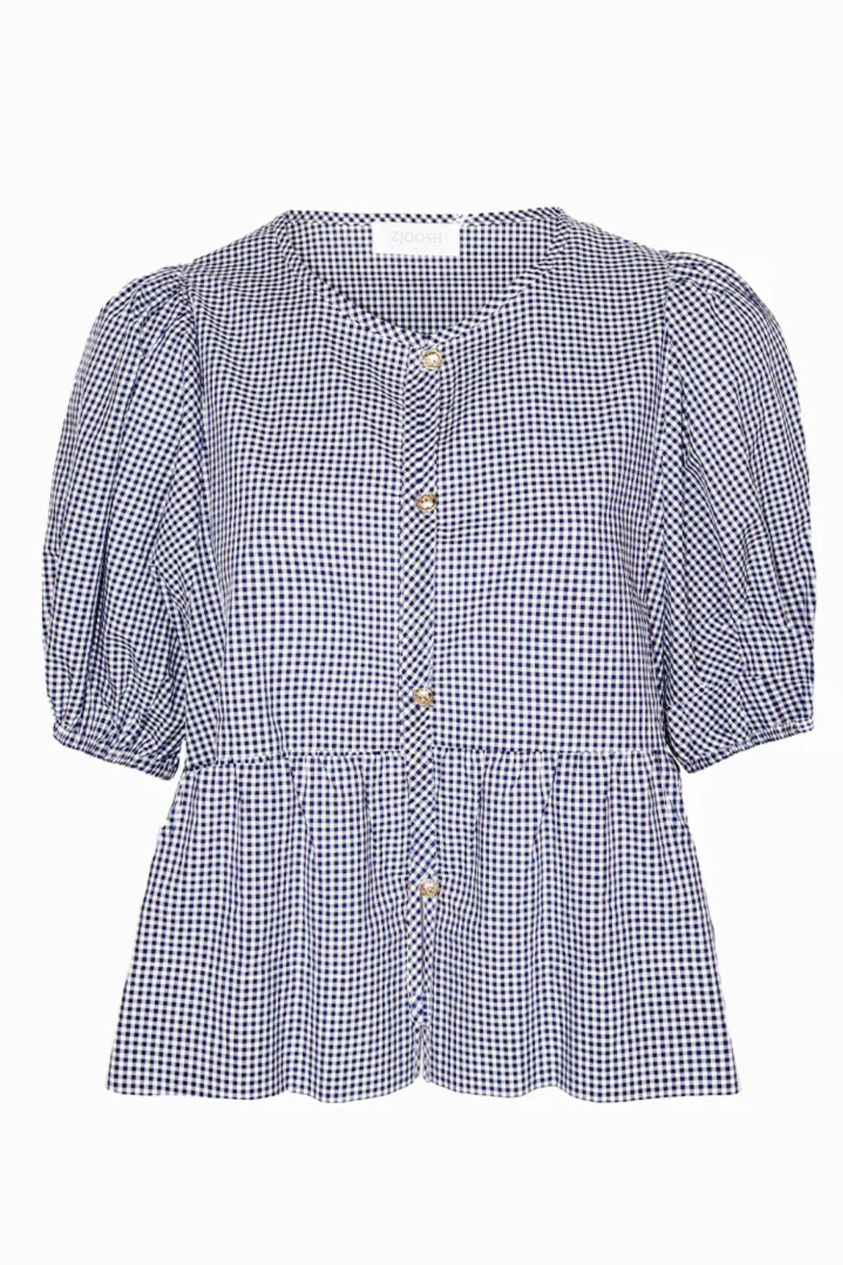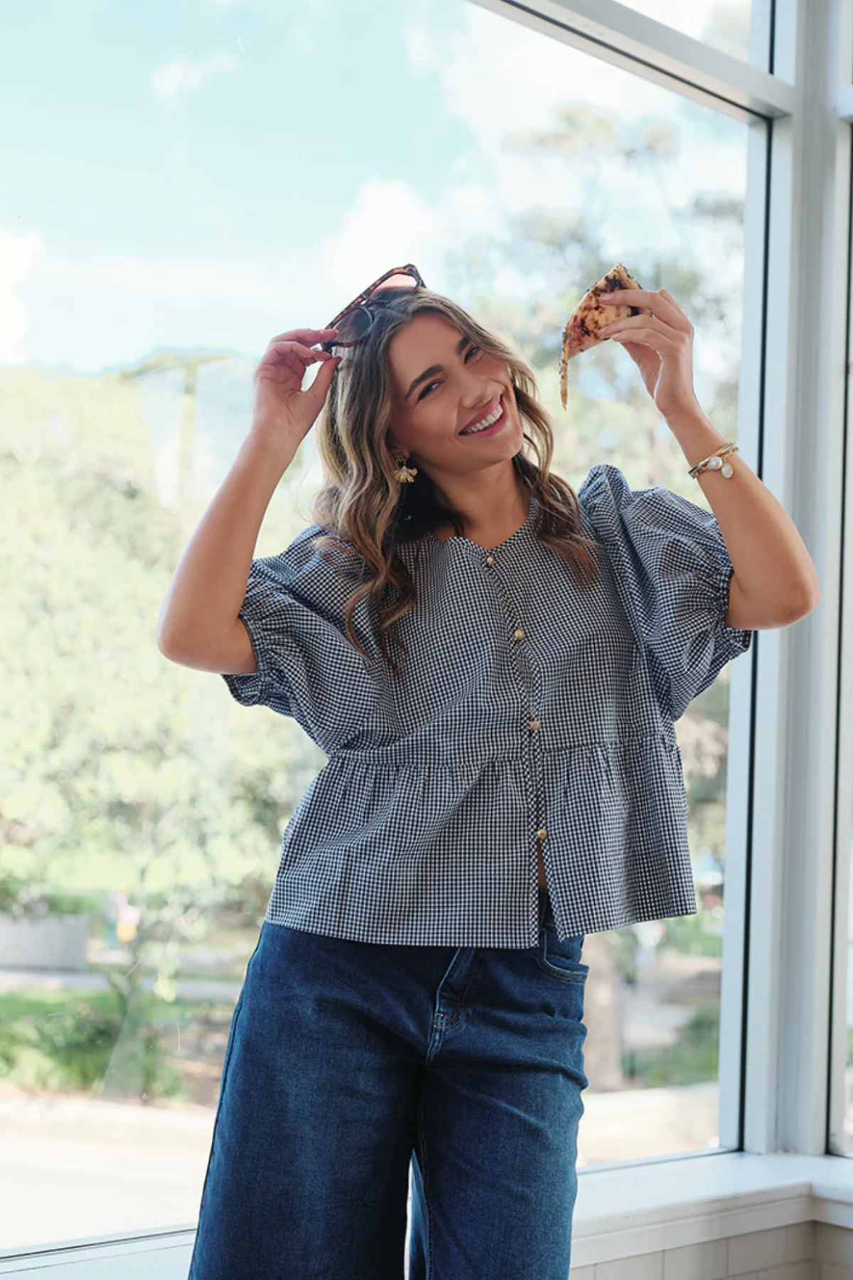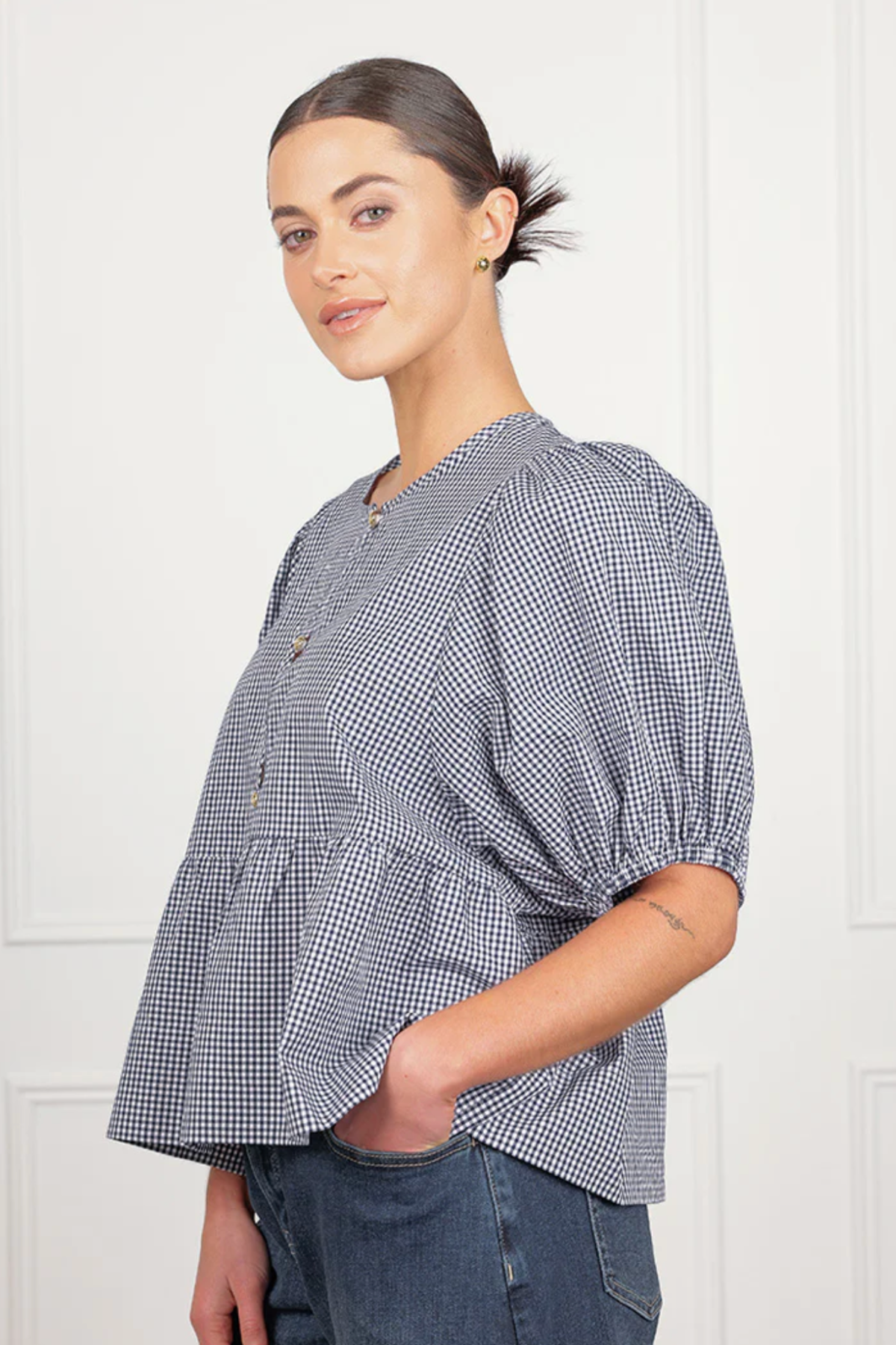 Refresh your everyday wardrobe with the Nadia Gingham Top in classic navy. Crafted from 100% cotton, this blouse combines comfort and effortless style with its relaxed, airy silhouette. The soft gingham check brings a timeless charm, while the gathered peplum hem and puff sleeves add feminine volume and structure.