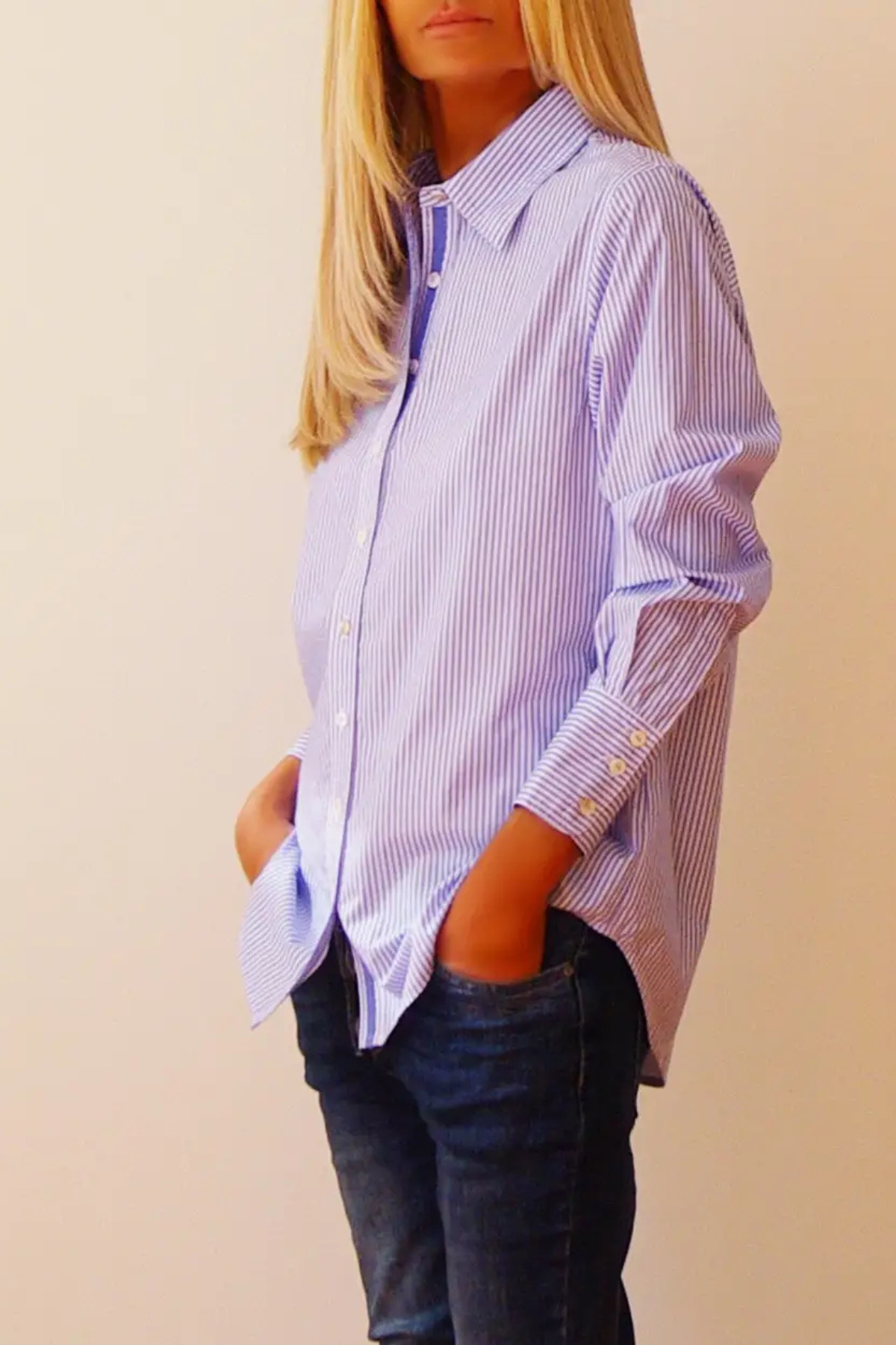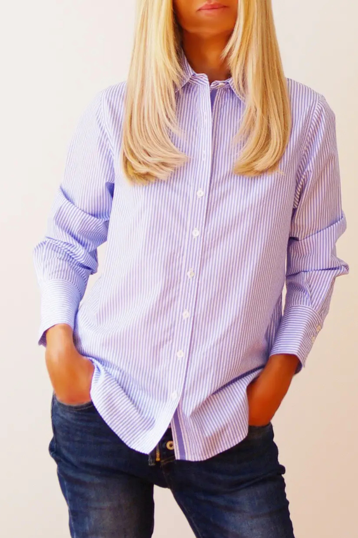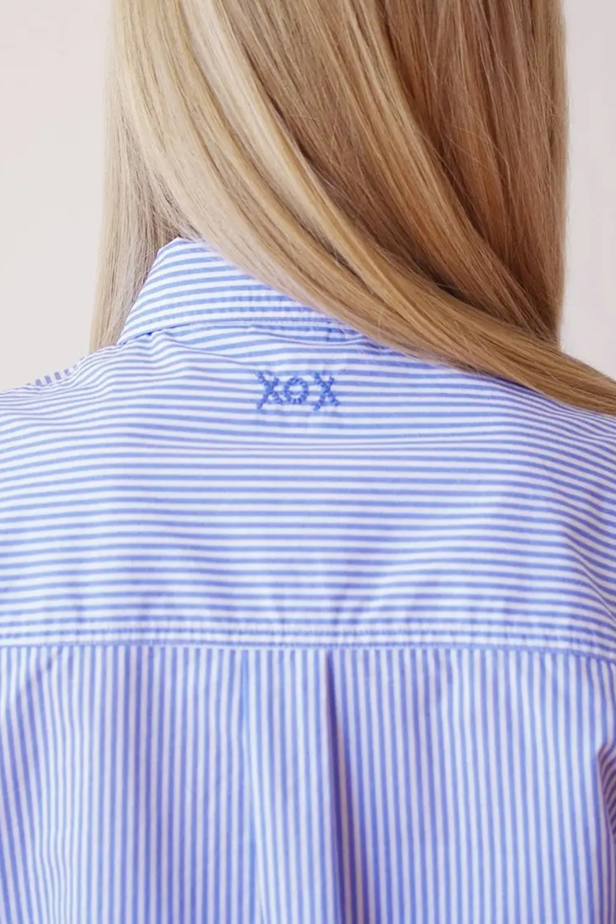 The Riley Classic Cut Shirt in Pale Blue & White Stripe is a timeless wardrobe essential with a beautifully refined twist. Featuring a slightly more fitted silhouette than the Maple and Poppy shirts, it offers crisp structure with classic collar and cuff detailing. The navy ribbon trim along the placket adds a chic, modern touch, while the subtle XOX detail makes it effortlessly special — a go-to shirt for workdays, weekends and everything in between.