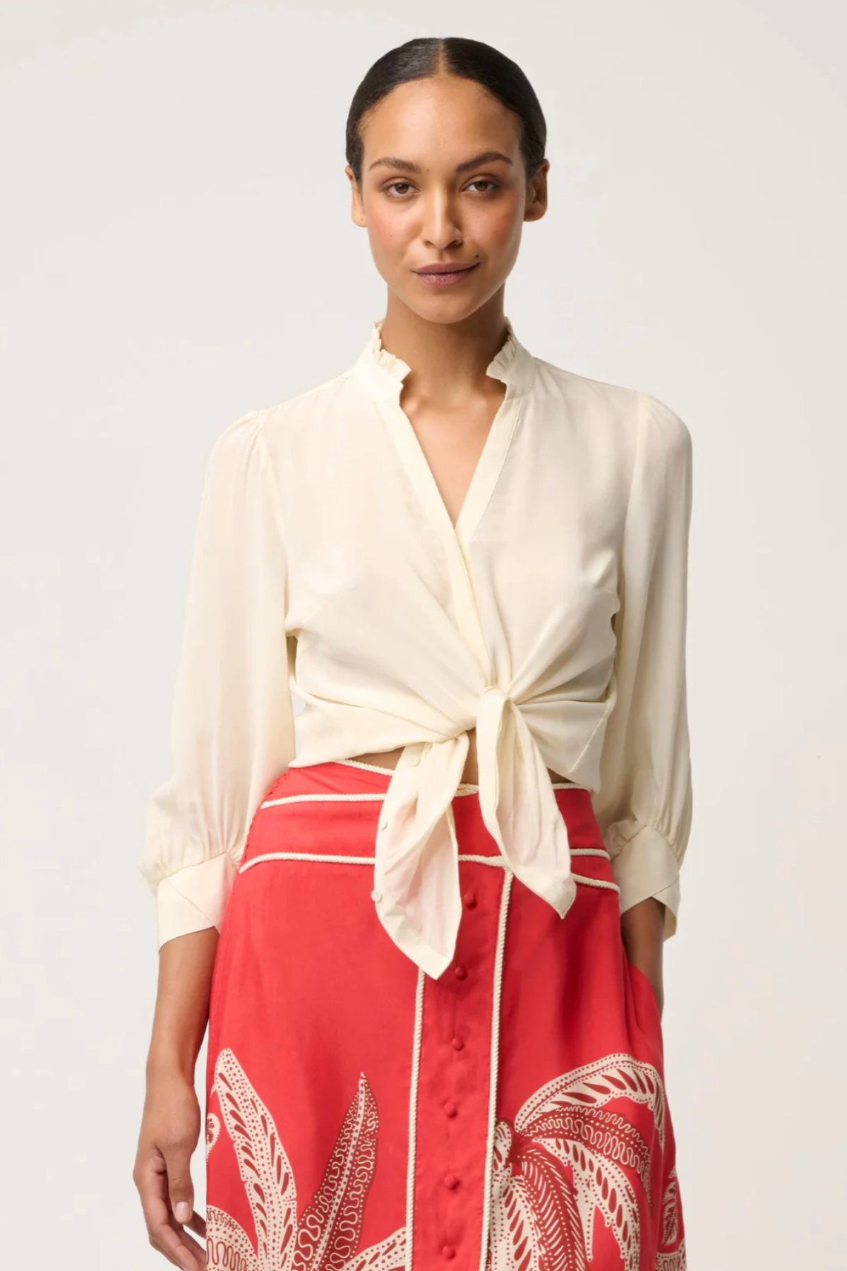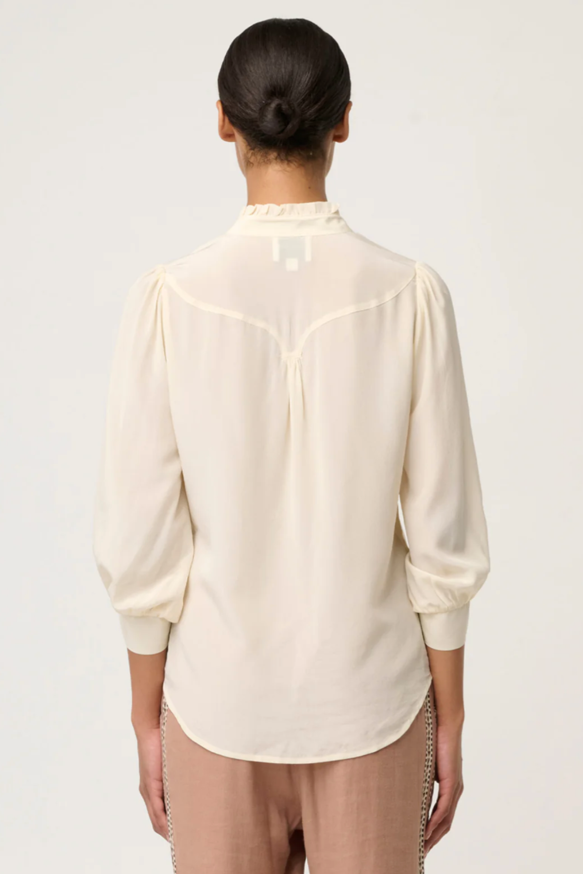 Whether tucked into tailored trousers for a polished office look or paired with denim for refined off-duty style, this shirt embodies versatility and timeless femininity.