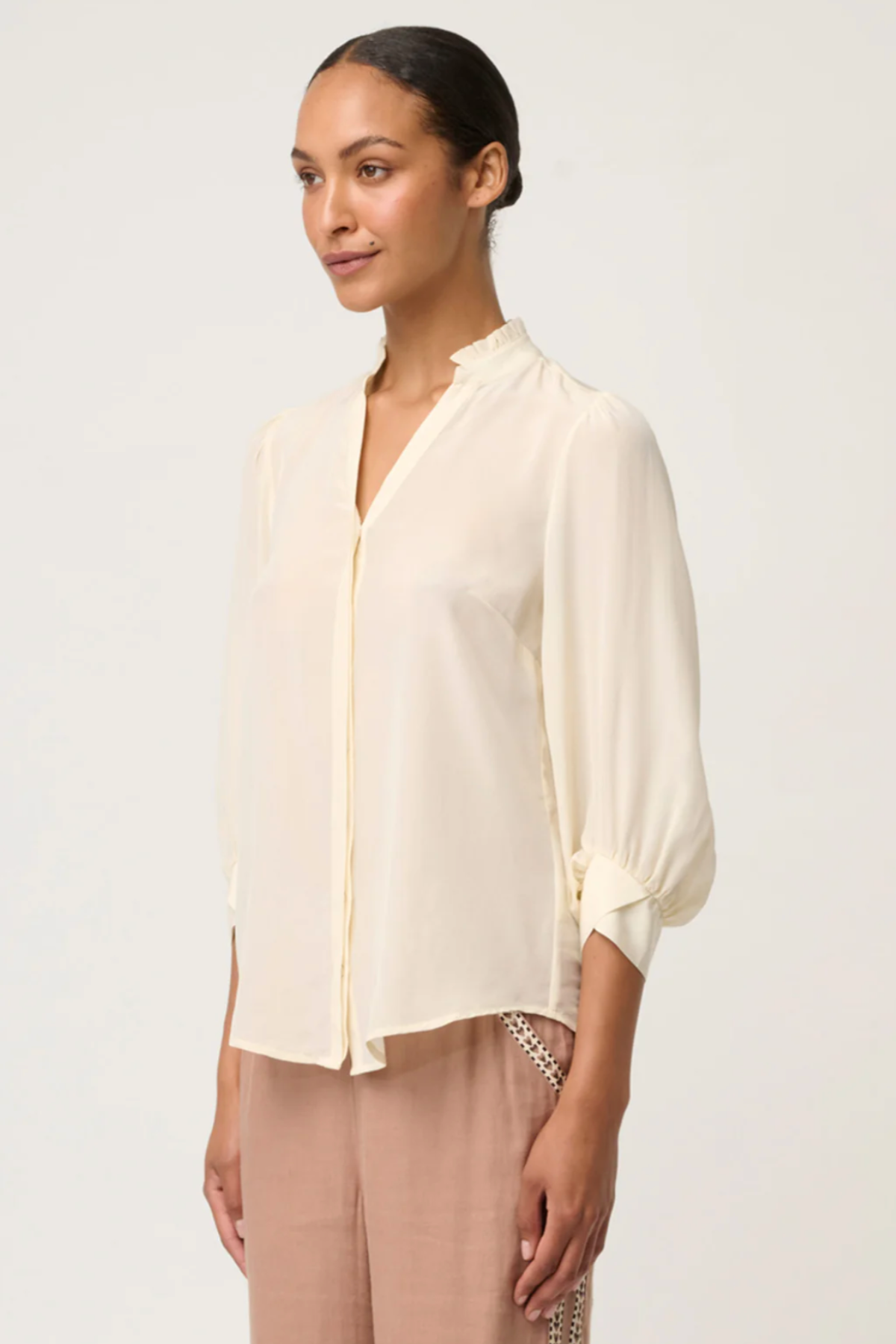 Designed with a relaxed fit and a flattering V-neckline, the Chloe Shirt features delicately gathered sleeves finished with criss-cross cuffs, adding a modern twist to a classic silhouette. The soft Cloud hue, a versatile off-white tone, makes it an essential wardrobe staple that transitions seamlessly from desk to dinner.