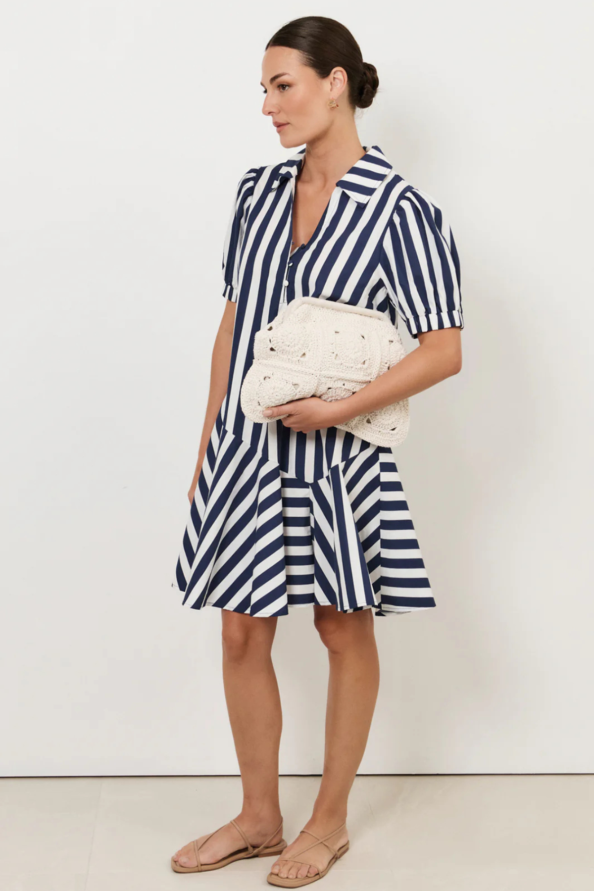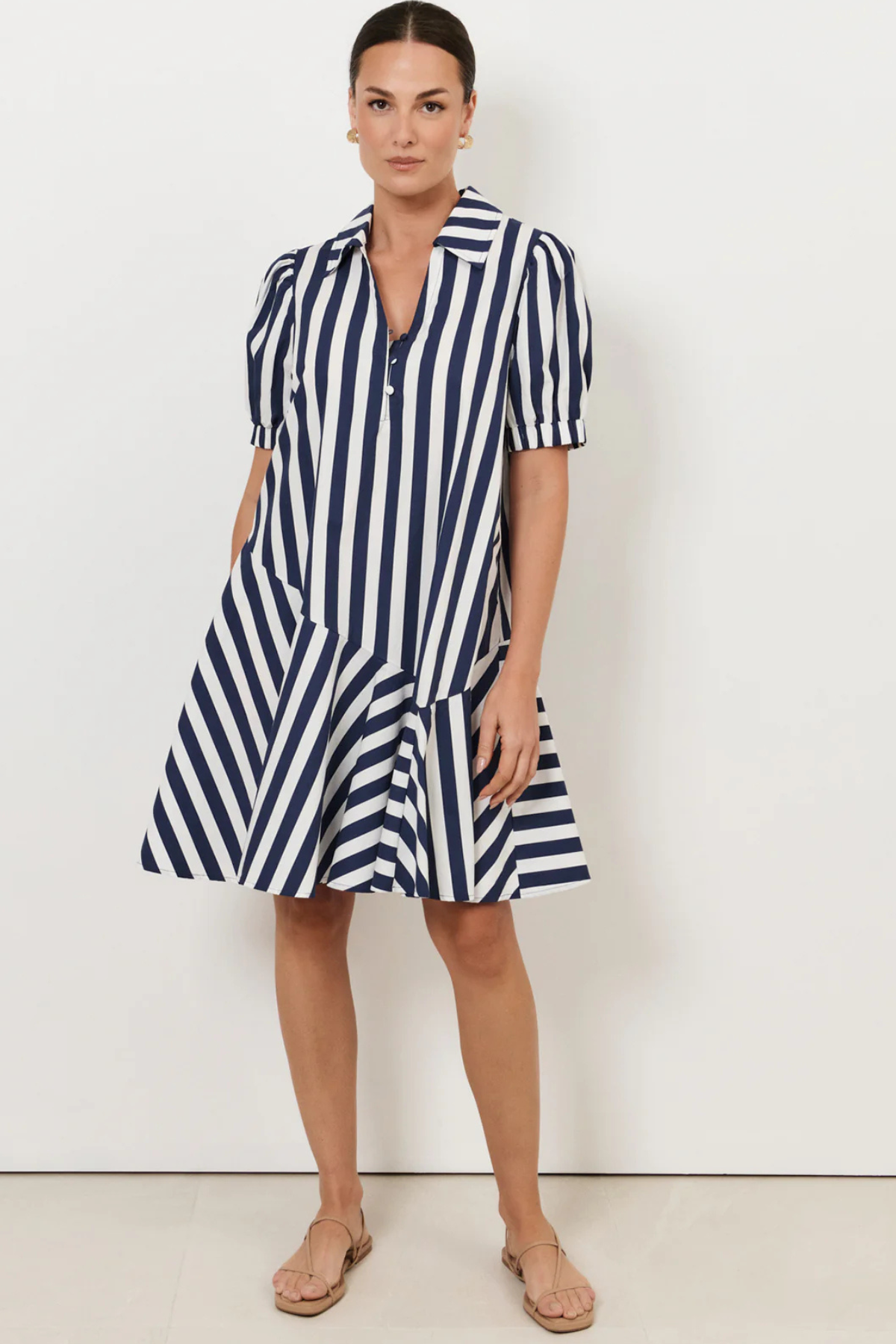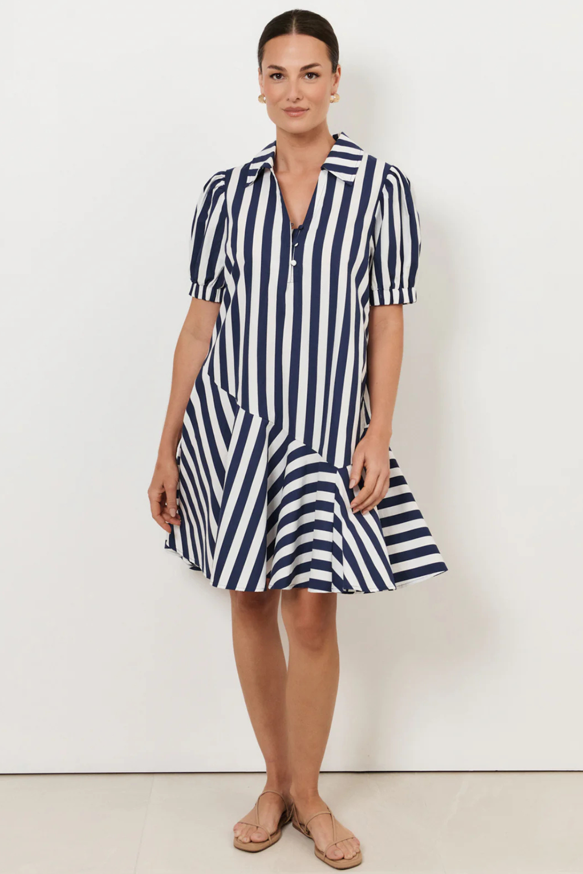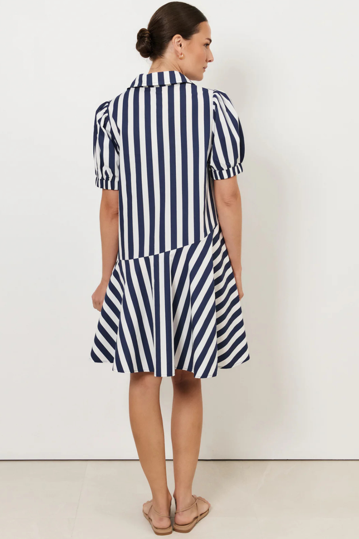 The Bee Asymmetric Drop Waist Short Dress in Stripe features a navy and white striped design with a drop waist and asymmetric hem. It has short puff sleeves with elasticated cuffs, an open V-neckline, and an exposed placket with self-covered buttons. Made from 100% cotton for a soft, breathable finish.