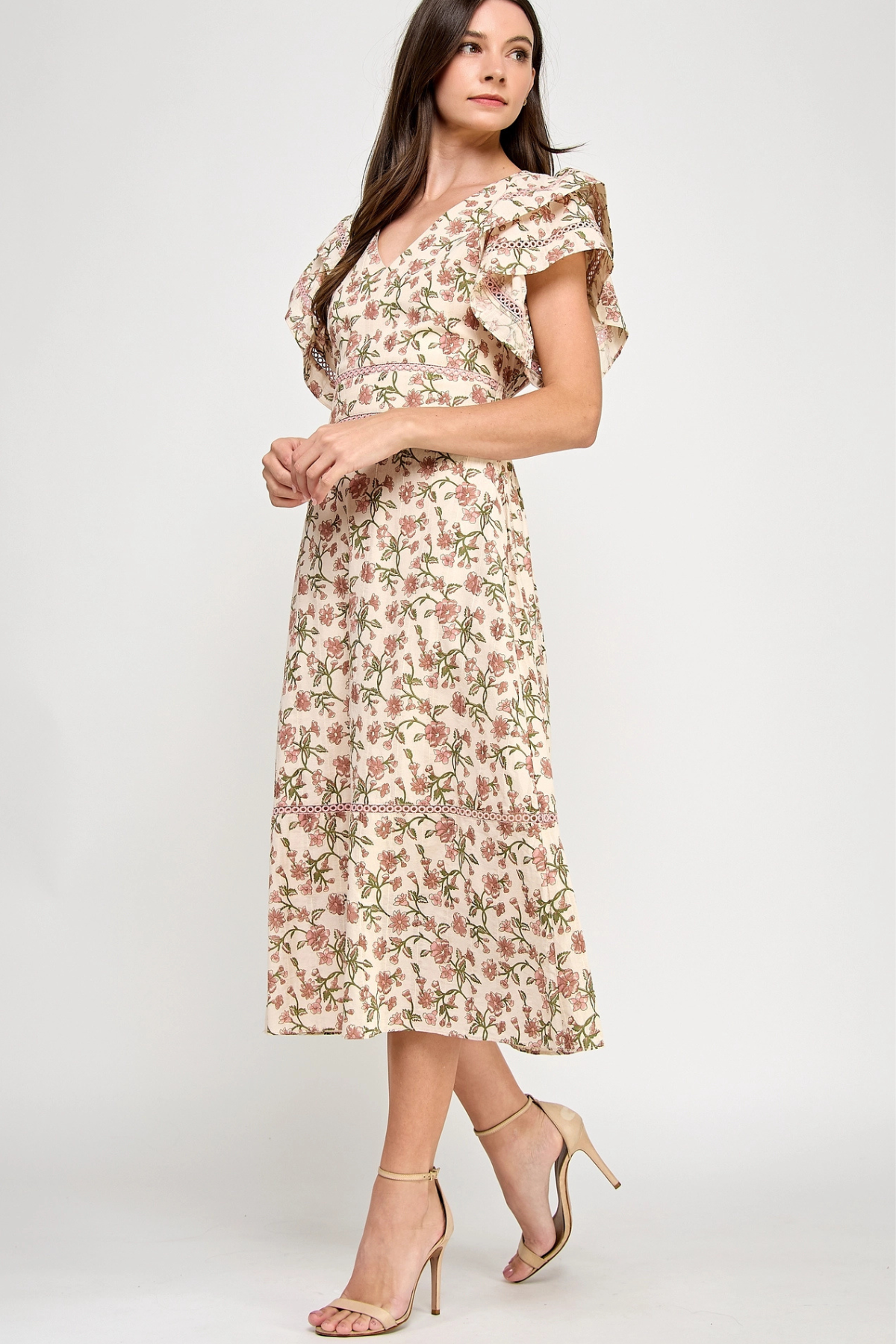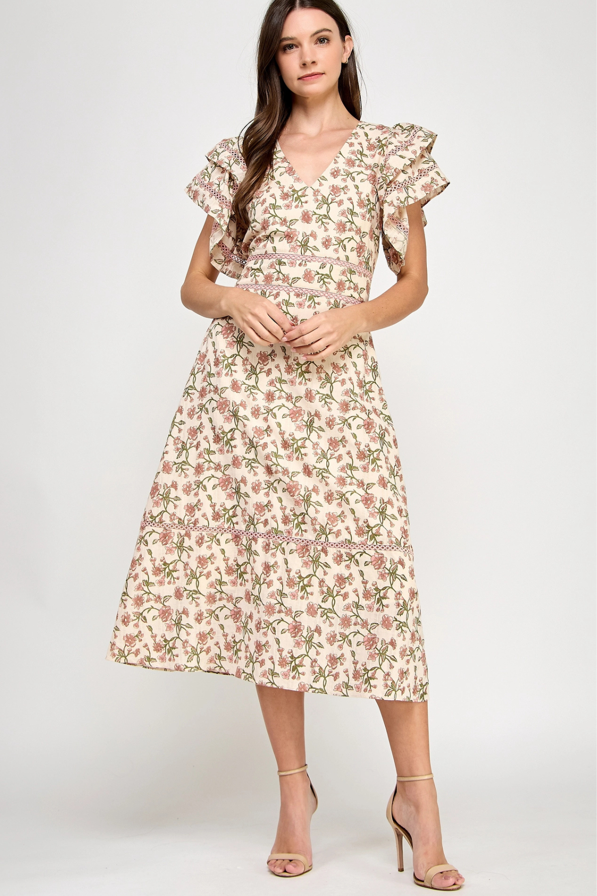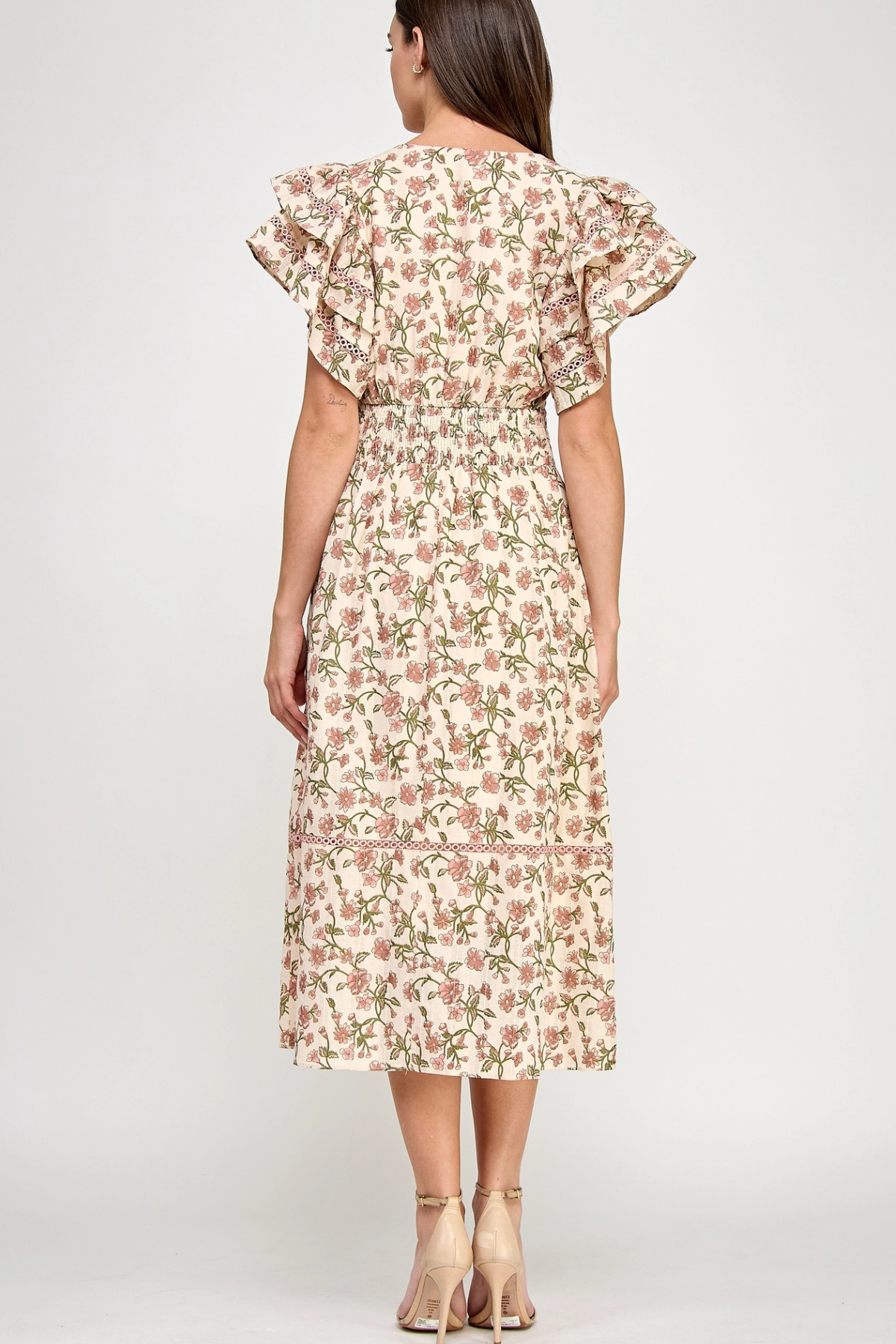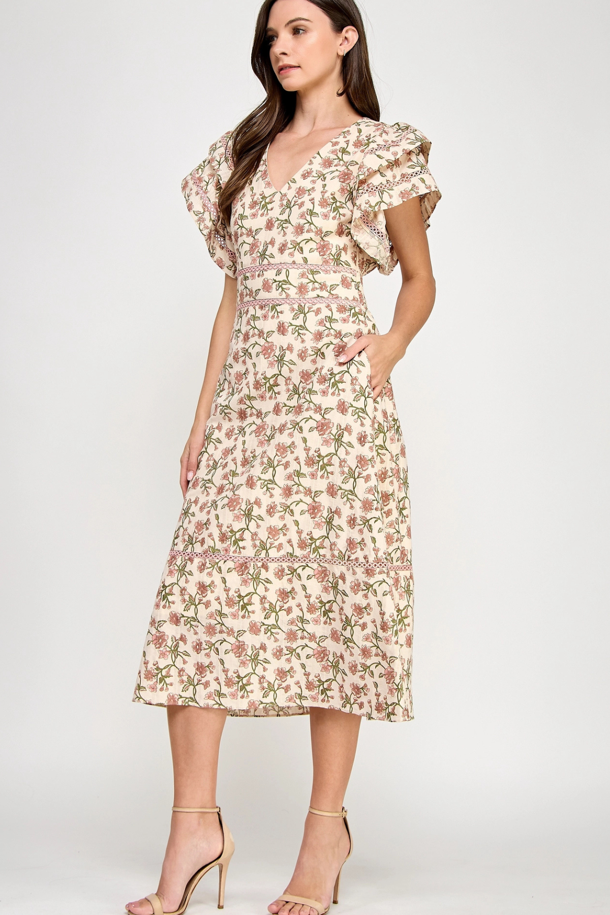 The Floral Ruffle Midi Dress is the perfect mix of soft romance and effortless summer style. Made from airy cotton voile in a delicate floral print, it features dreamy lace trims, fluttery layered sleeves and a flattering V neckline. With its easy midi silhouette and comfortable cinched waist, it’s a beautiful choice for long lunches, festive gatherings and warm, breezy days.