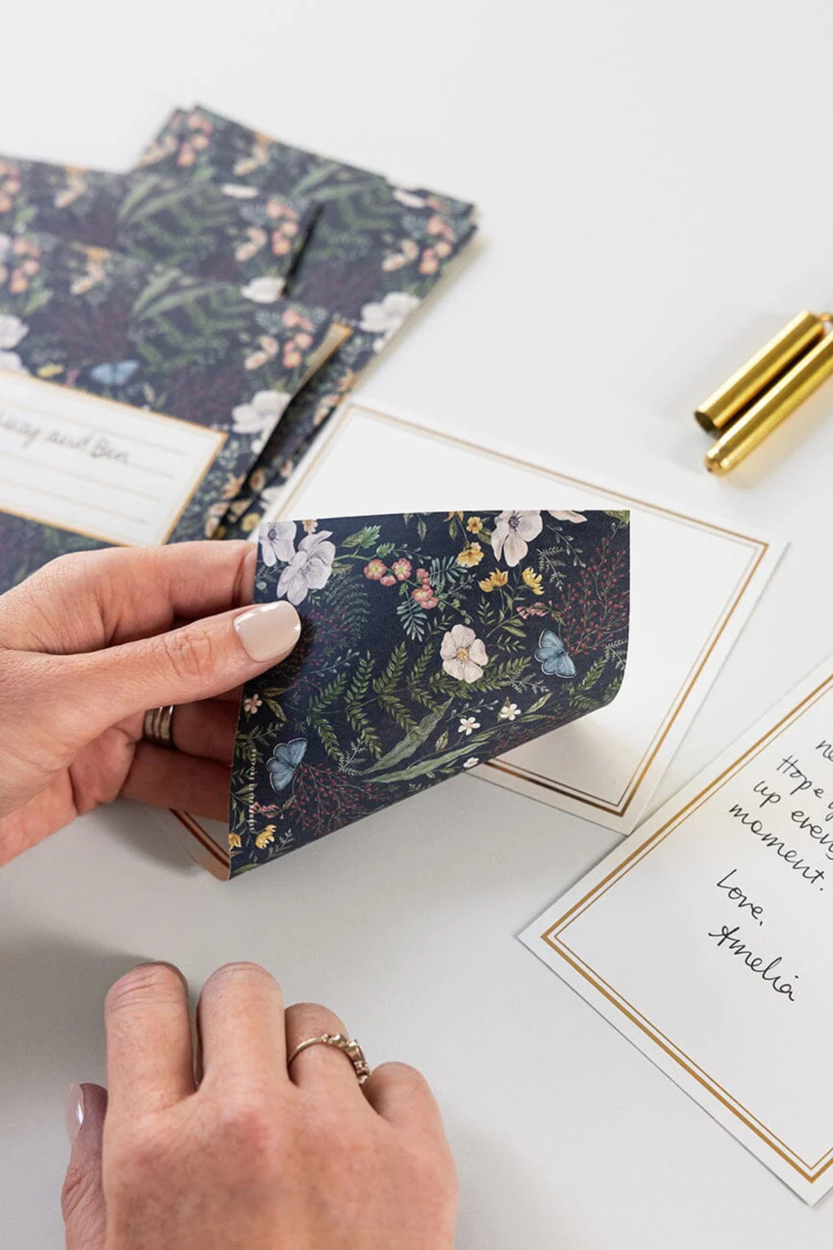 - Double-sided notecards with two unique finishes: