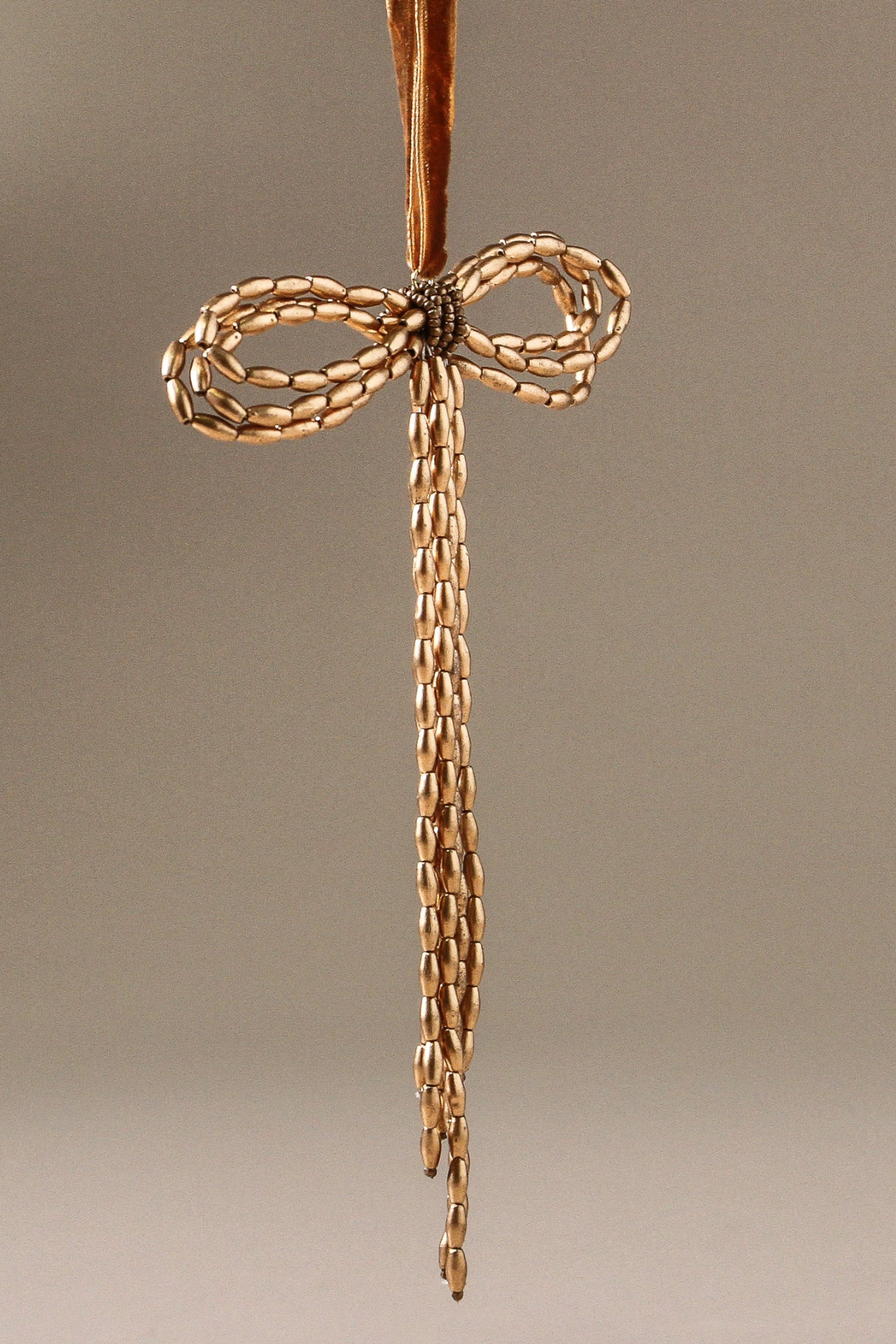 Formed from fine golden wire and decorated with golden elongated beads, the Kindred Beaded Bow is delicate, weightless, and full of charm. Its soft curves and light-catching finish make it feel like jewellery for the tree — elegant and intentional. A symbol of gathering and giving, it ties the collection together with a quiet, golden flourish.