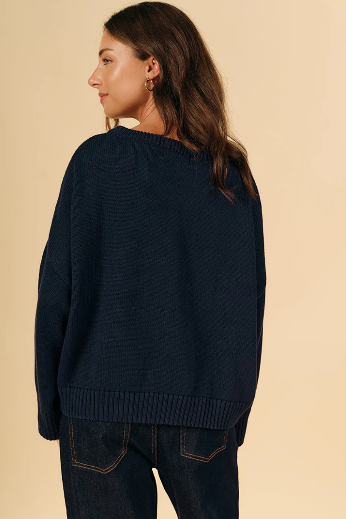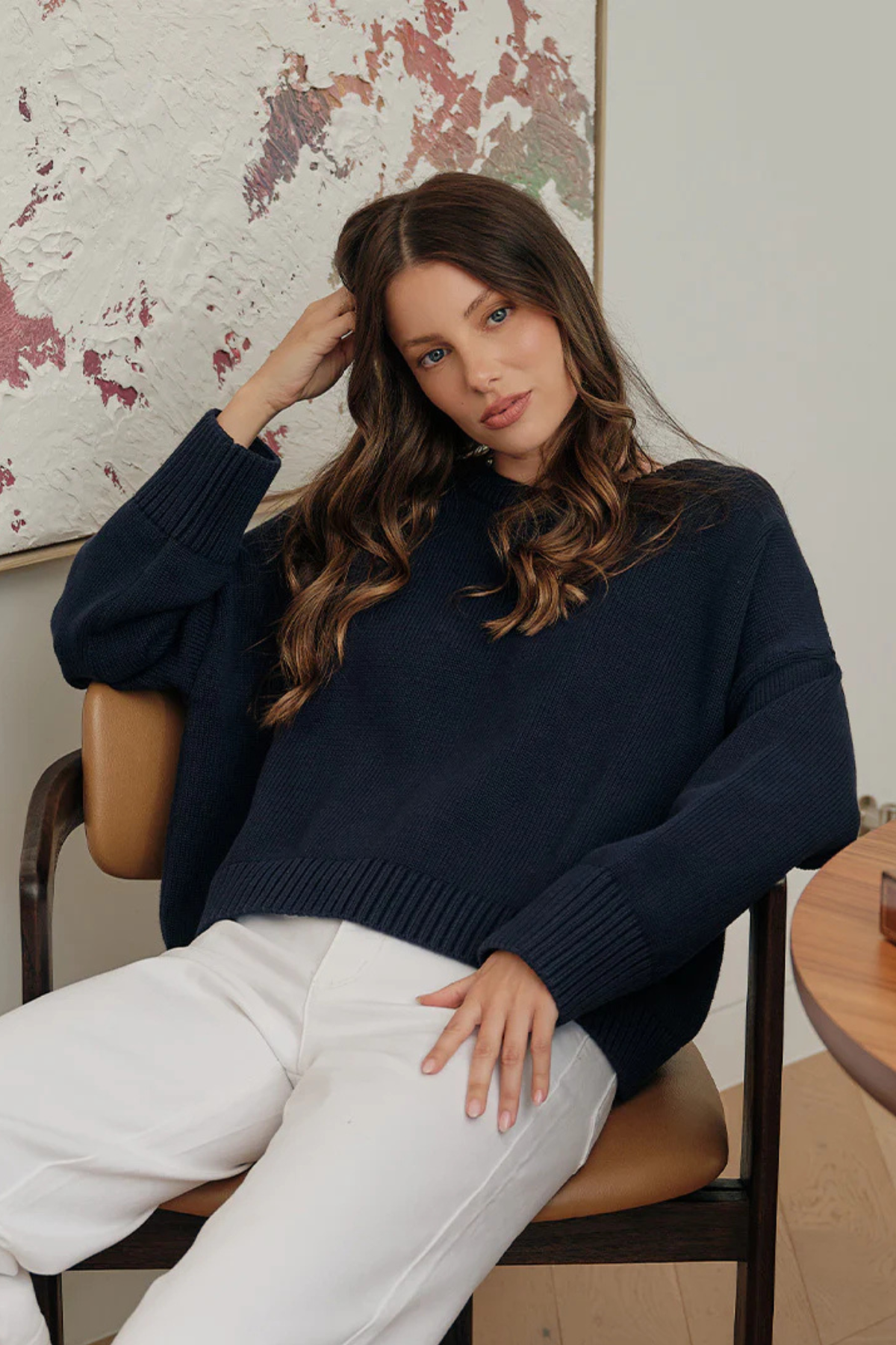 Crafted from premium 100% cotton, the Carla Cotton Crew Neck Jumper offers ultimate softness and breathability. This knit features a relaxed silhouette with dropped shoulders and chunky ribbed detailing at the neck, cuffs, and hem, providing a polished yet effortless look.