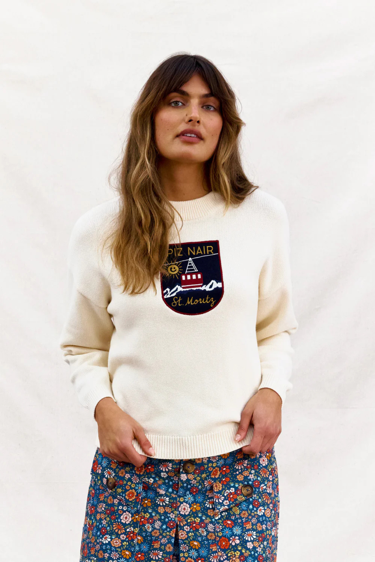 A classic cotton snow white crew knit with a wink. Piz Nair refers to several mountains in Switzerland, most famous of all St. Moritz. We love a European winter, the cable car, the apres, the charming timber lodges with adorable alpine details twinkling on a sunny day in the snow. It's just like the Sound of Music but winter jumper version. The perfect cotton transeasonal knitwear with a very cute embroidered badge. Booking the lodge in Falls.