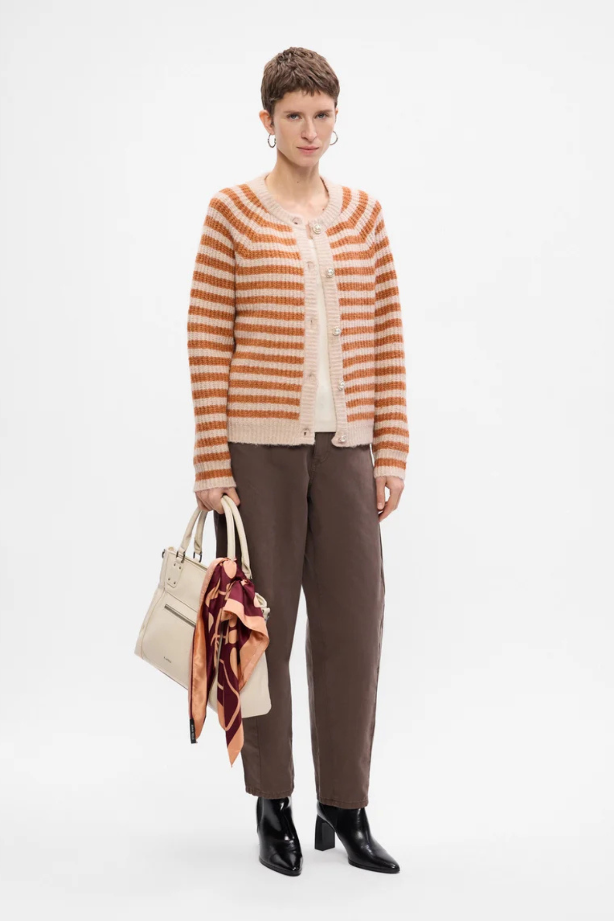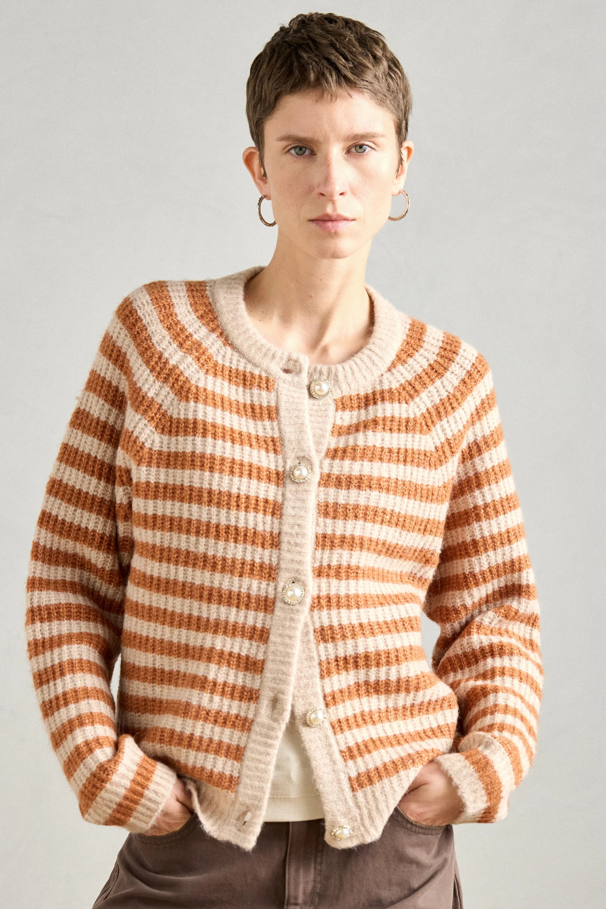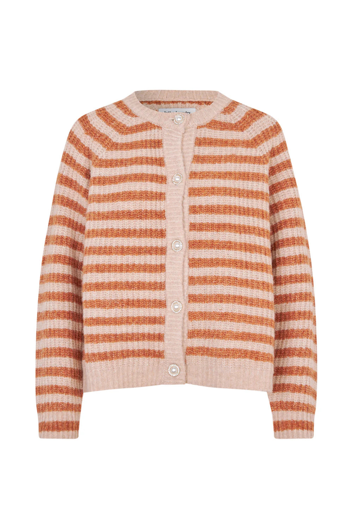 The Nova Knit Cardigan is a timeless striped knit with a feminine twist. Designed with a relaxed fit and classic round neckline, it’s finished with beautiful statement buttons decorated with pearls and rhinestones — making it just as perfect for everyday wear as it is for dressier occasions.