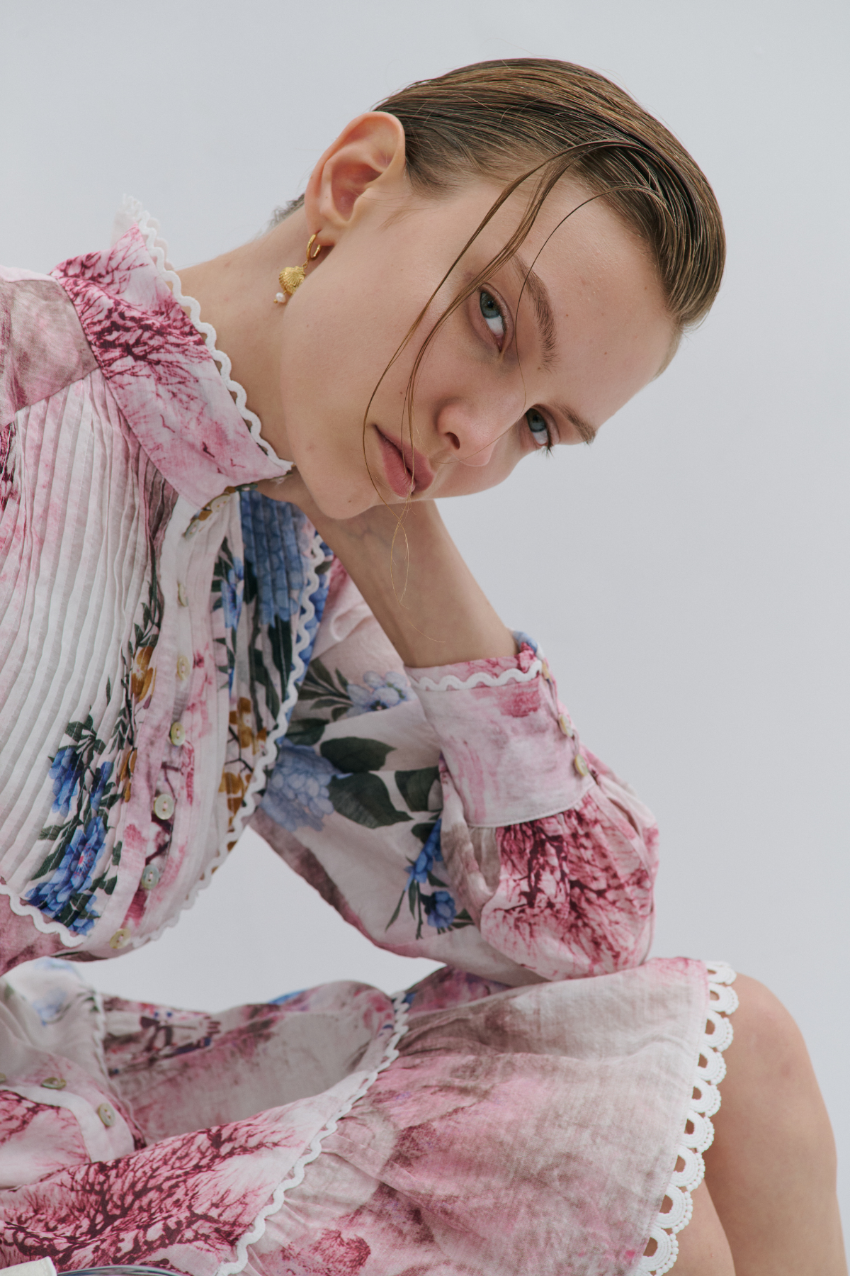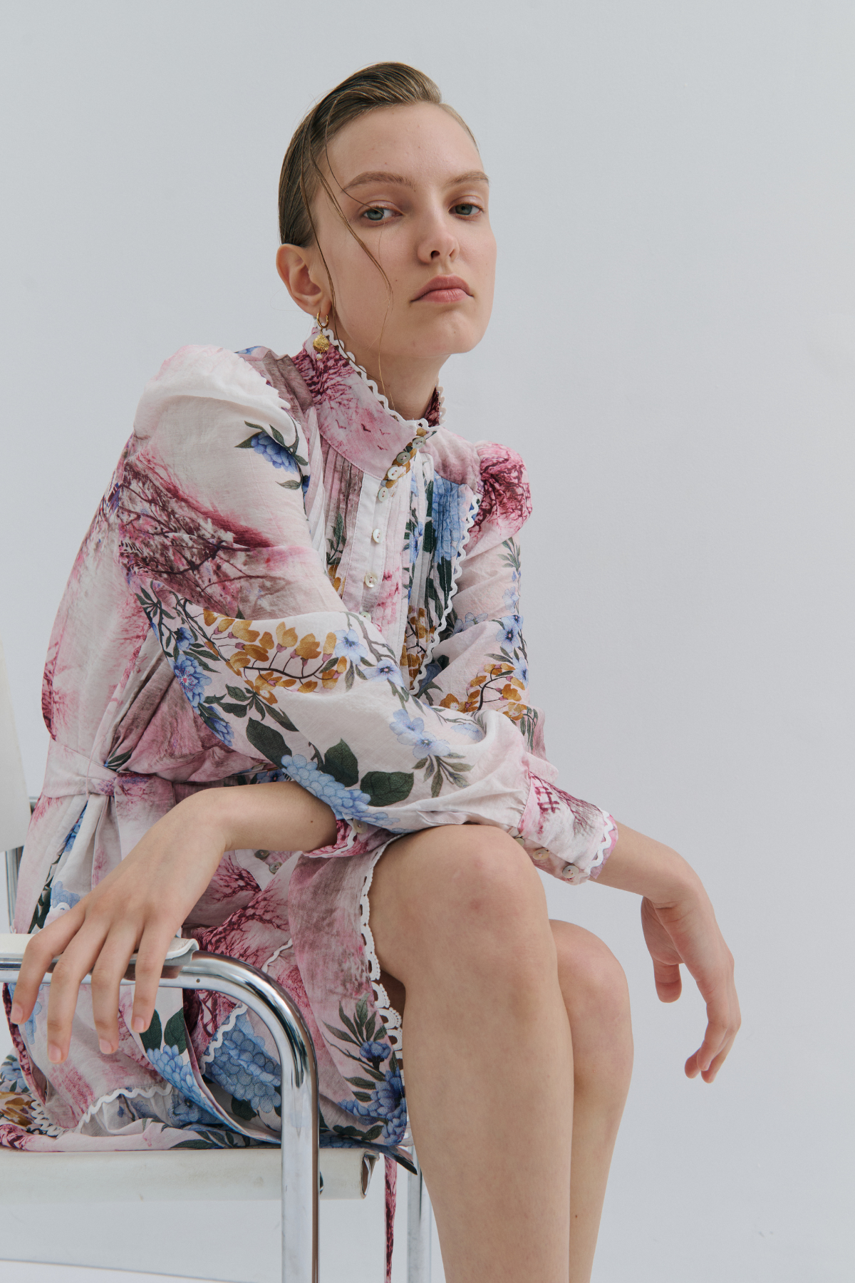 Ethereal and elegant, the Charlotte Mini Dress in Snow Queen captures Maevarii’s romantic spirit in a fresh palette of soft blush, ivory, and delicate blue florals. Crafted from natural, breathable fabric, this dreamy dress features a high shirred neckline with button-front placket, pin-tuck detailing across the bodice, and long sleeves with buttoned cuffs. The tiered mini skirt creates graceful movement, while a self-tie belt cinches the waist for a flattering fit.