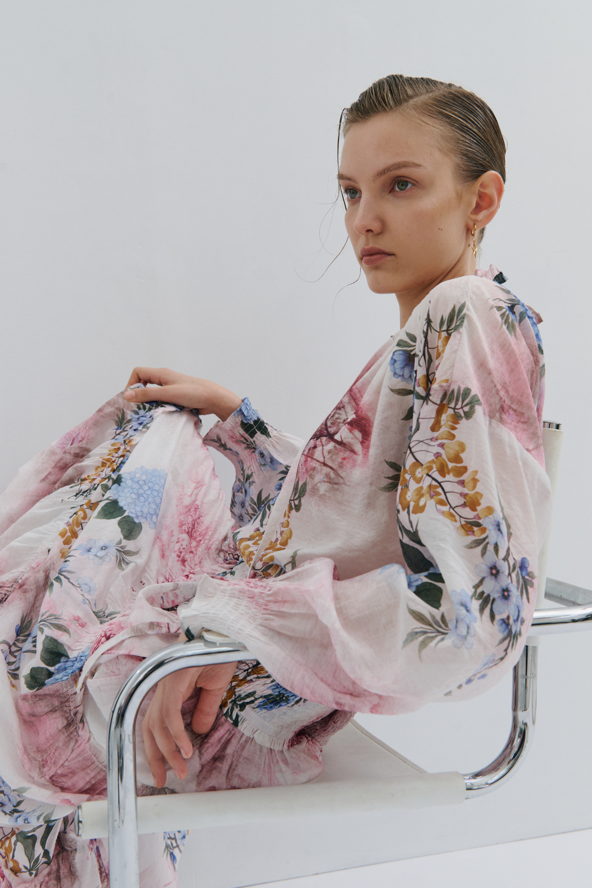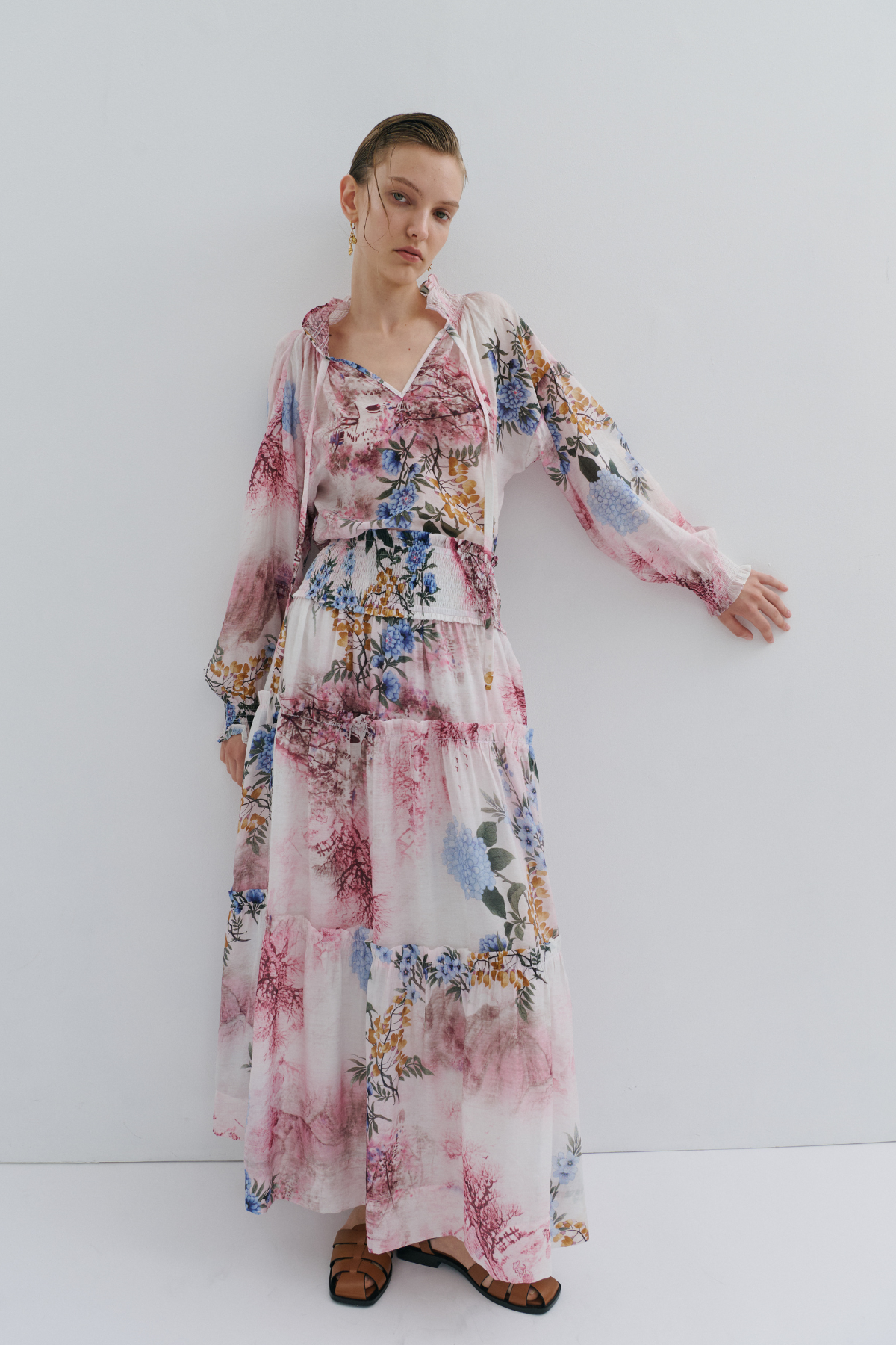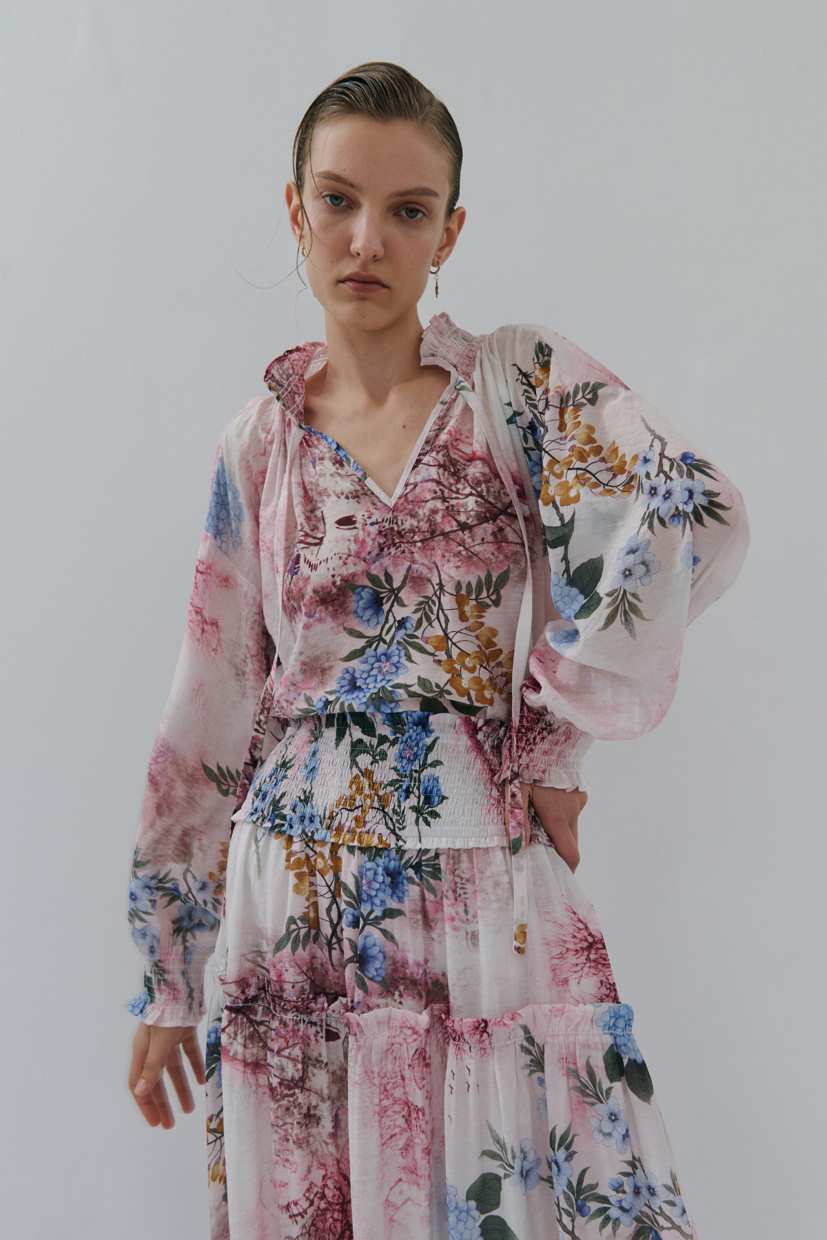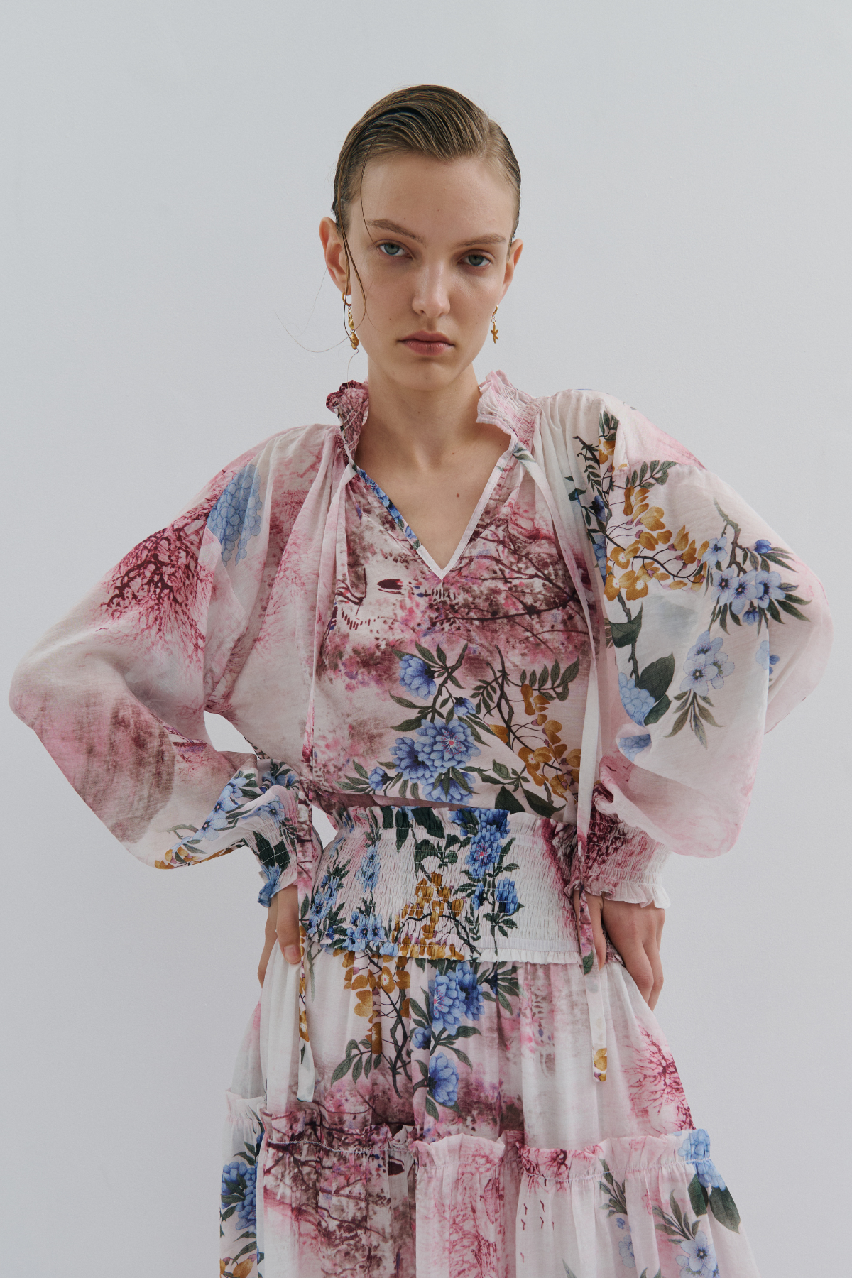 Romantic and free-spirited, the Poets Blouse in Snow Queen is a dream of soft movement and effortless femininity. Crafted in a delicate floral print of soft pinks, sky blues, and golden blooms, this blouse celebrates artisanal detail with its flowing silhouette, billowing sleeves, and shirred waistband. The tie-front neckline and subtle ruffle trim bring a touch of bohemian poetry, making it a versatile piece that floats easily between day and evening.