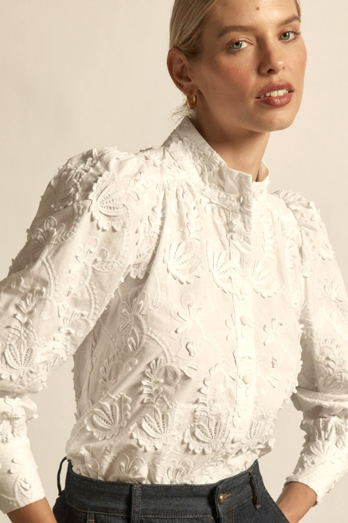 Subtle gathers flowing from the sleeve into the yoke for soft shape
