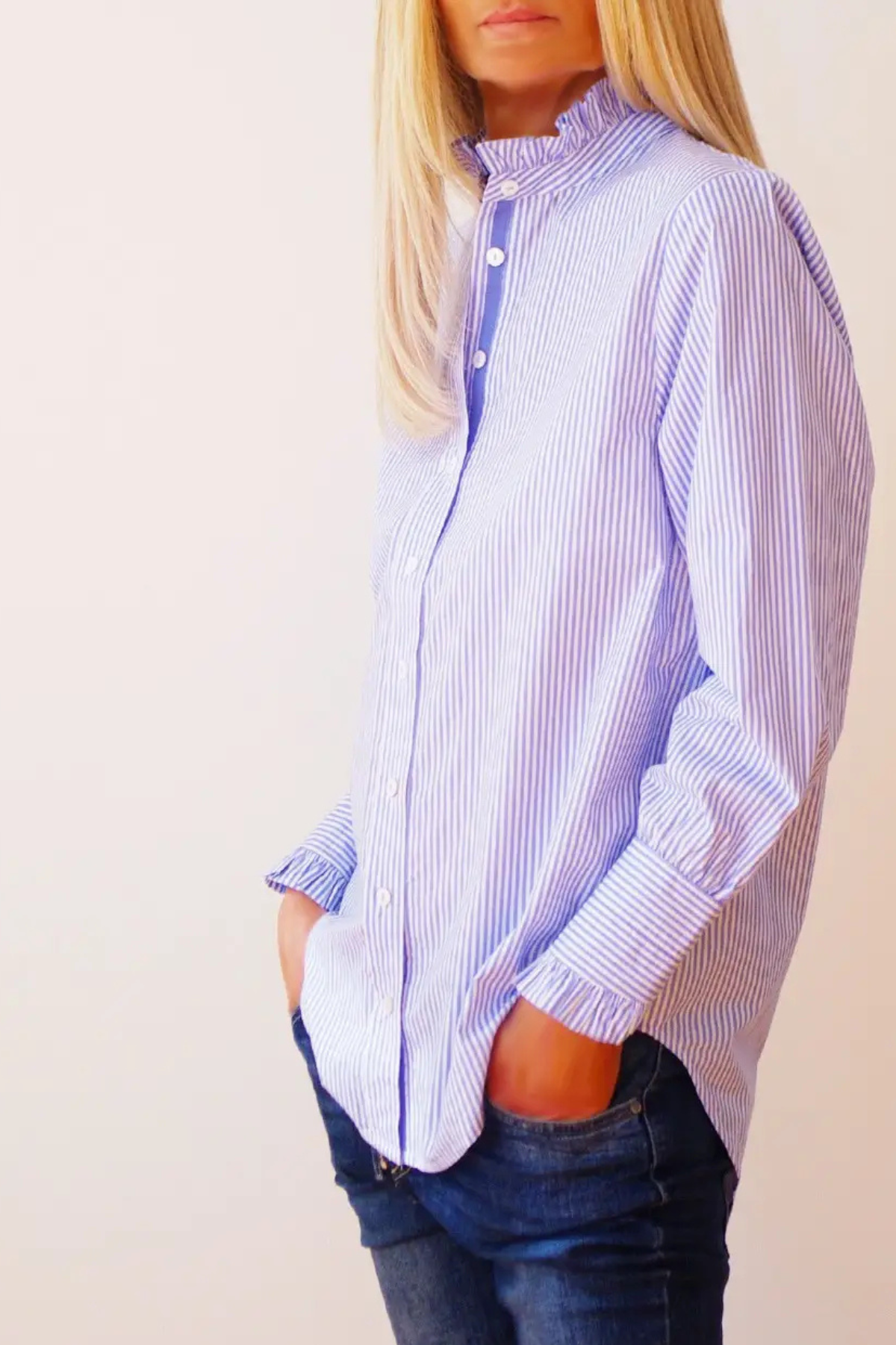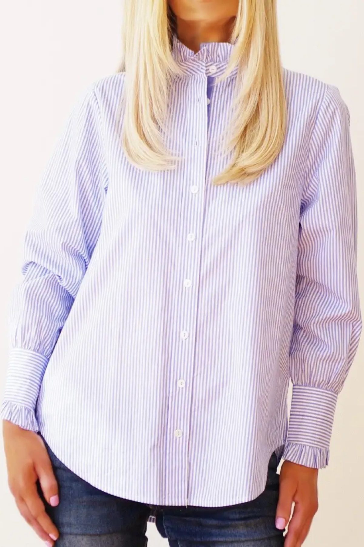 The Lottie Shirt in Pale Blue & White Digital Stripe offers a soft, feminine take on a classic button-up. Crafted from luxuriously soft 100% cotton, it features delicate frill detailing at the collar and cuffs, plus a flattering scooped back that adds shape and gentle movement. Elegant, effortless and perfect for everyday wear or polished occasions.