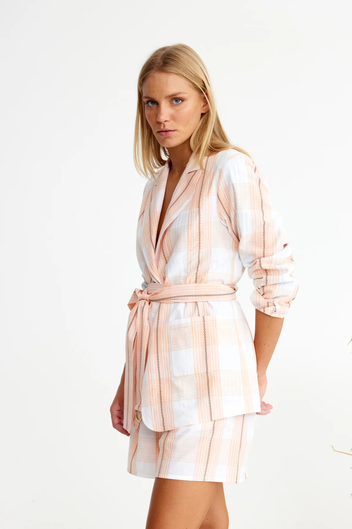 Neigh. Swishes tail, trots in, ears forward, demands attention. 100% cotton in peach plaid, it’s fully lined with a contrast pink stripe pop. Patch pockets. Removable D ring belt lets you switch between tailored & relaxed in one swift move. Lightweight yet polished, it’s perfect for throwing over dresses, pairing with shorts, or as a matching set. A versatile show pony.