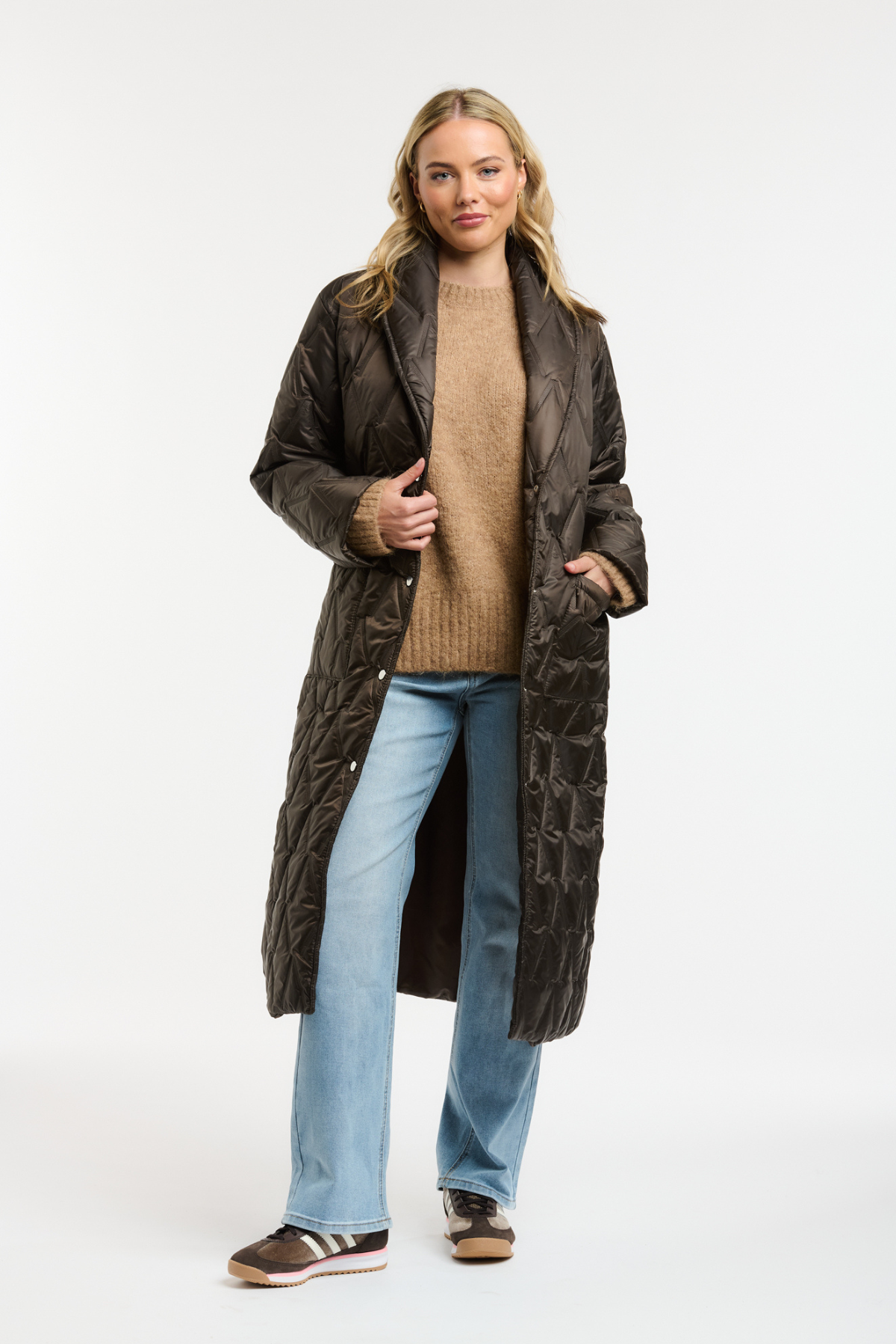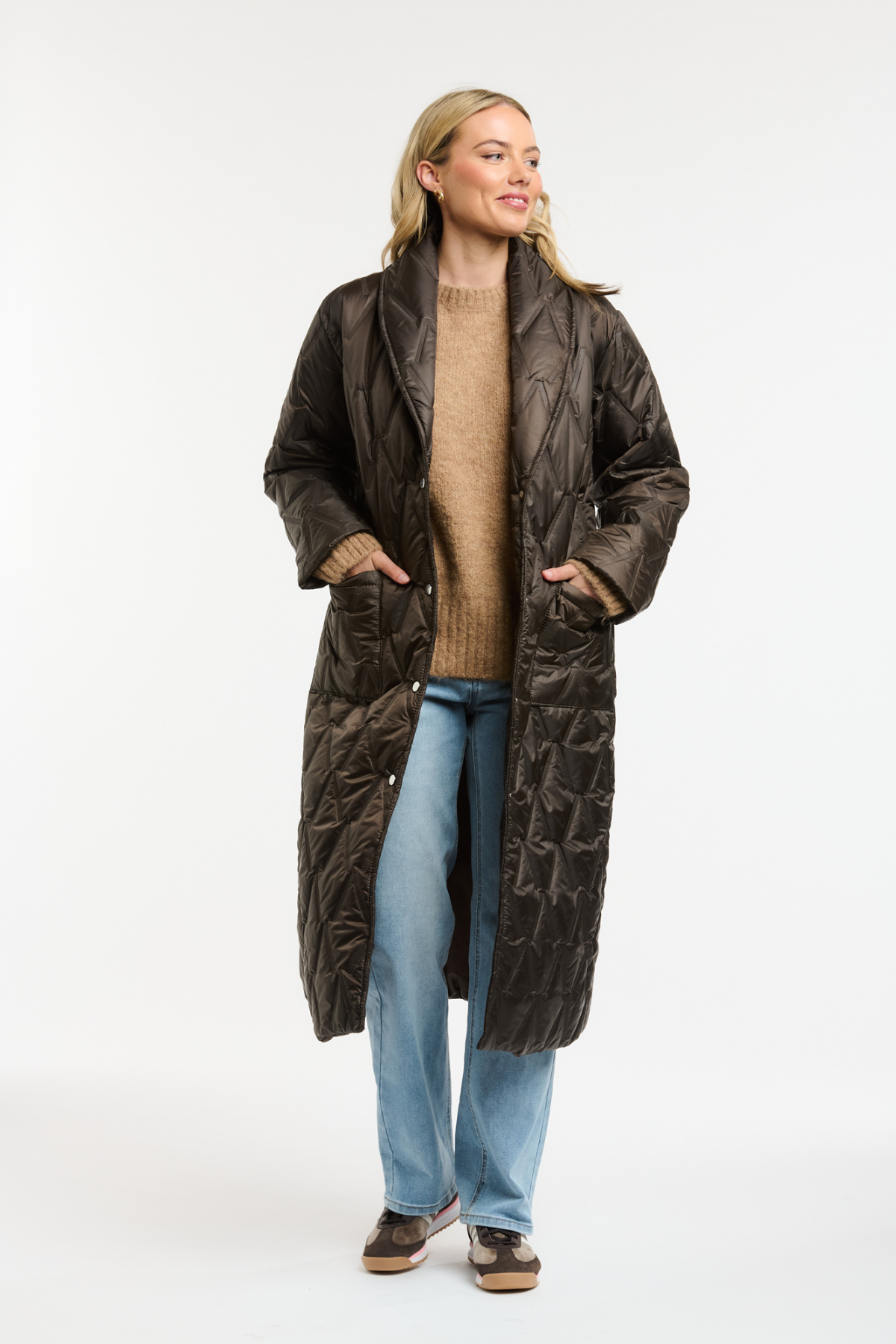 Designed in a rich chocolate tone with a soft quilted finish, it features an oversized collar, snap button front and a waist belt for a flattering shape. Easy to throw on over your favourite knits and denim for everyday warmth.