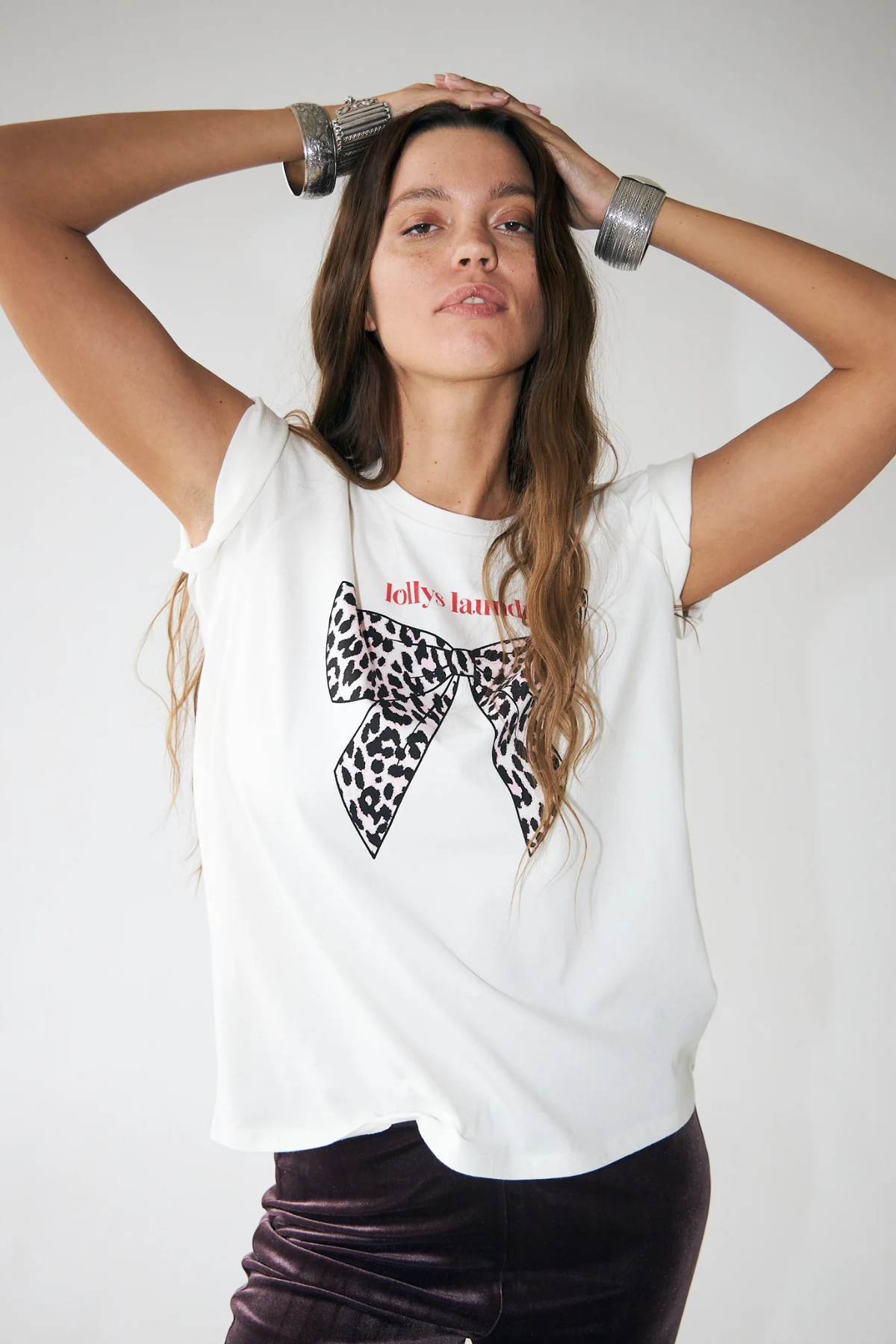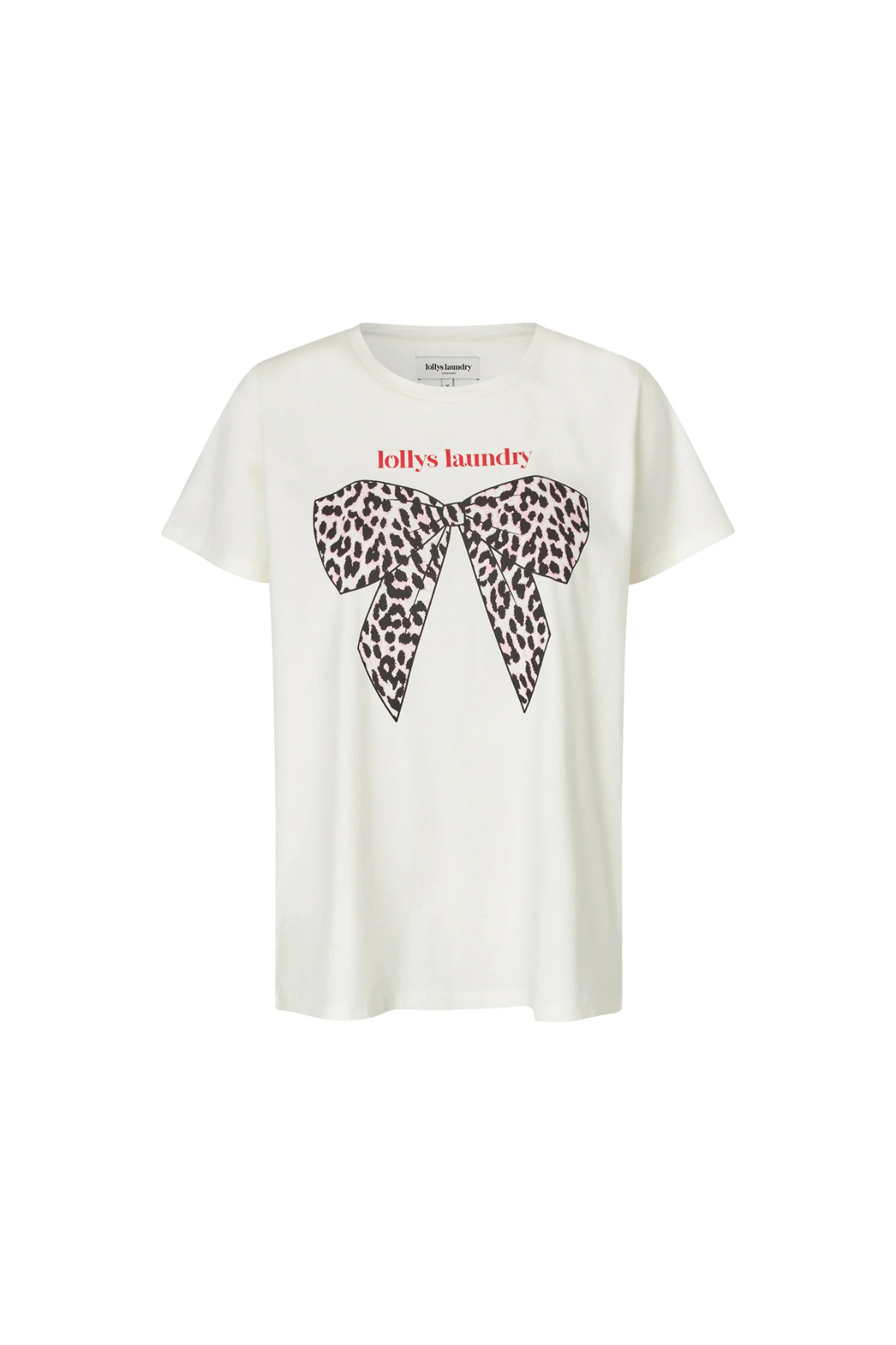 Crafted from soft cotton, it features a relaxed silhouette with a round neckline and short sleeves. The standout detail is the bold front print—a leopard-patterned bow paired with the Lollys Laundry logo—adding a touch of personality to a simple base.