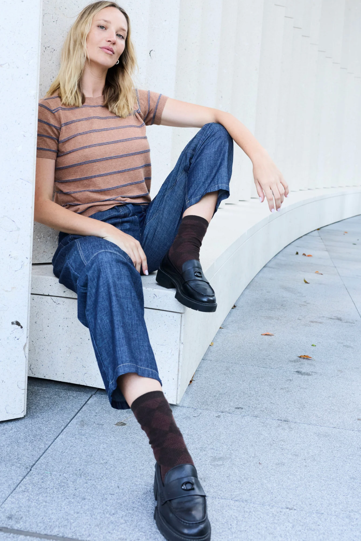 We love the easy, elevated feel of the Sable Stripe Knit Tee. A classic knit tee with a subtle hint of sparkle, this is the kind of piece that quietly lifts your everyday without trying too hard.