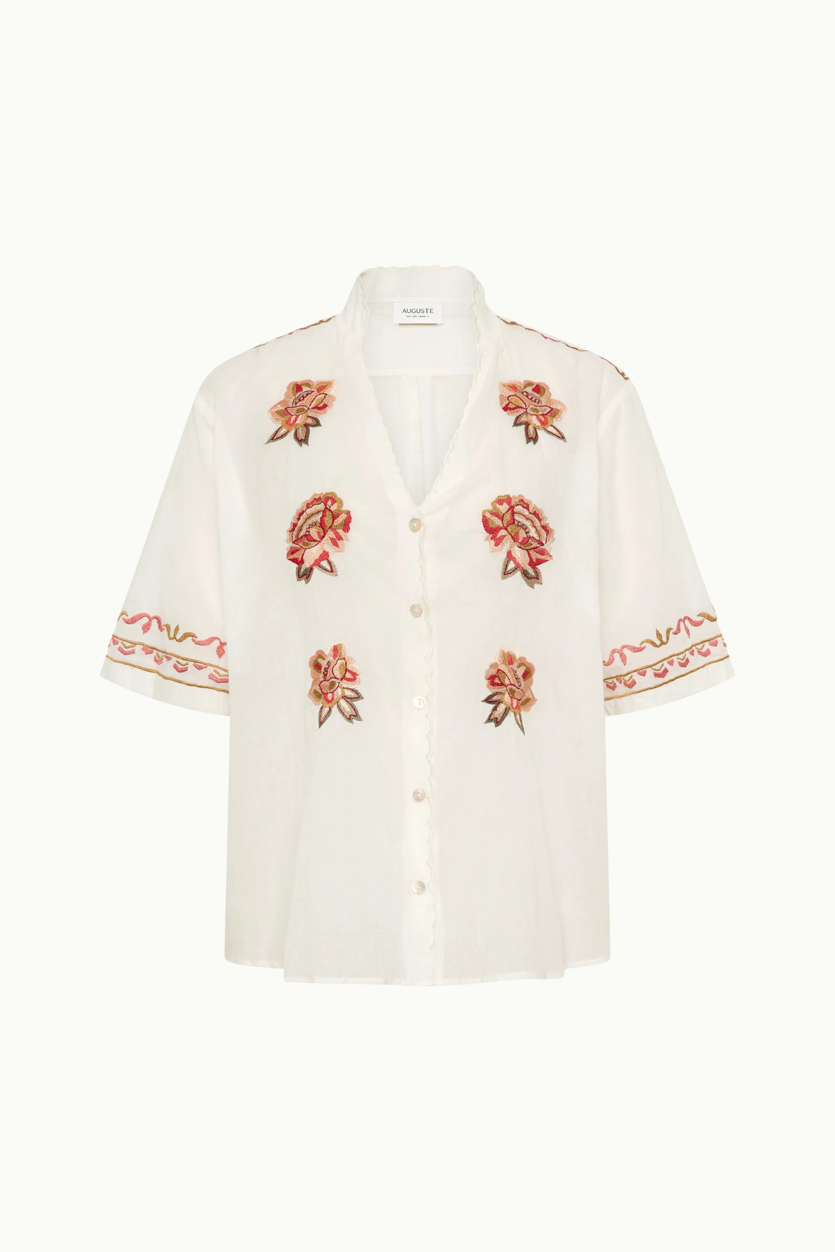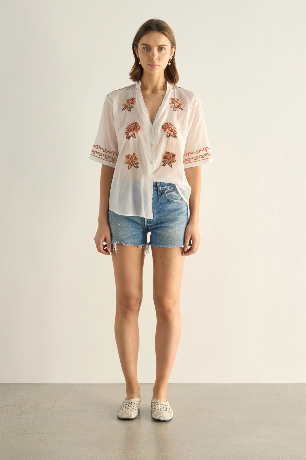 Nothing screams Auguste like our artisan blouses — the Vesper Embroidered Blouse. Hand embroidered on soft organic cotton voile, it features delicate scalloped detailing and intricate embroidery along the neckline and button closure. Designed in an oversized fit, this romantic style is effortlessly versatile — it’s your denim’s new best friend.