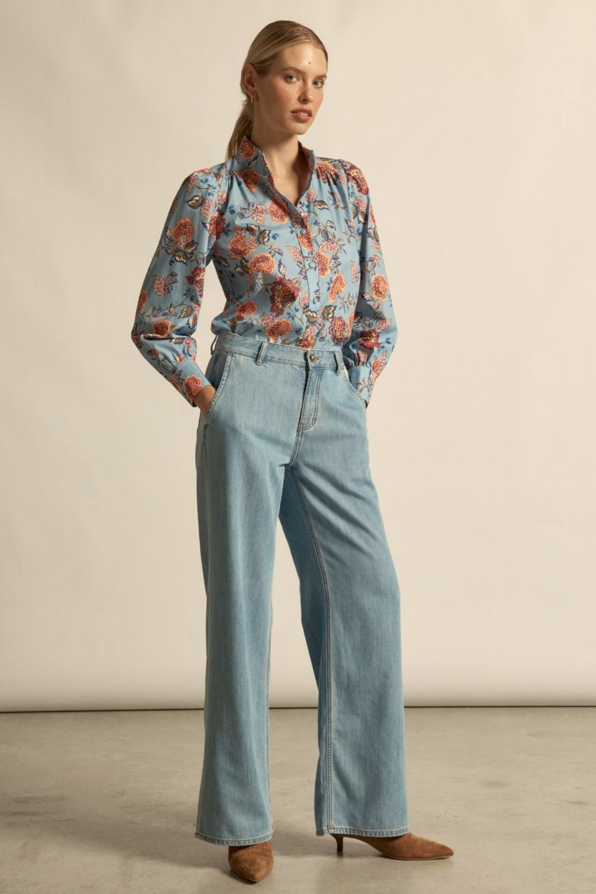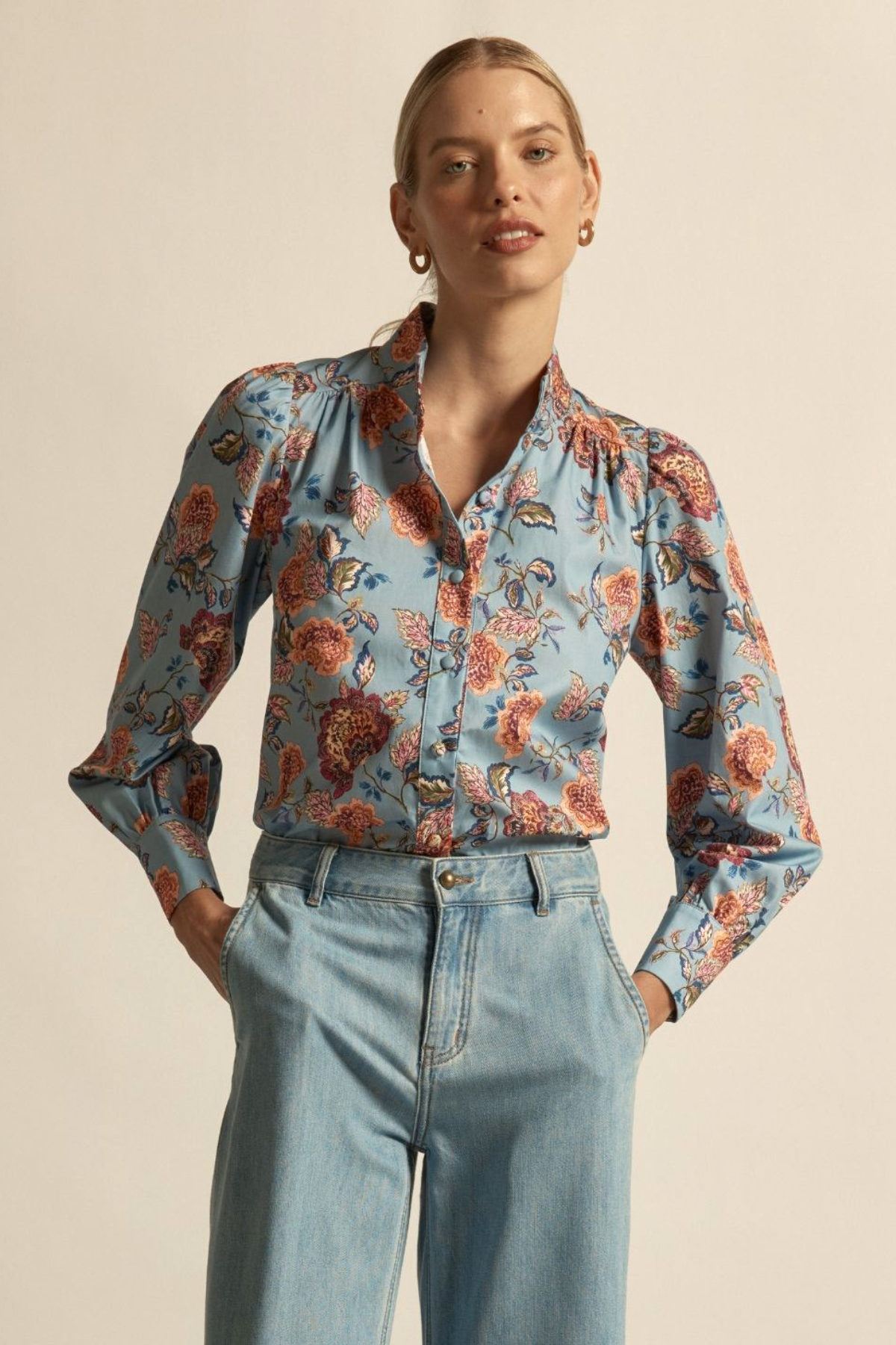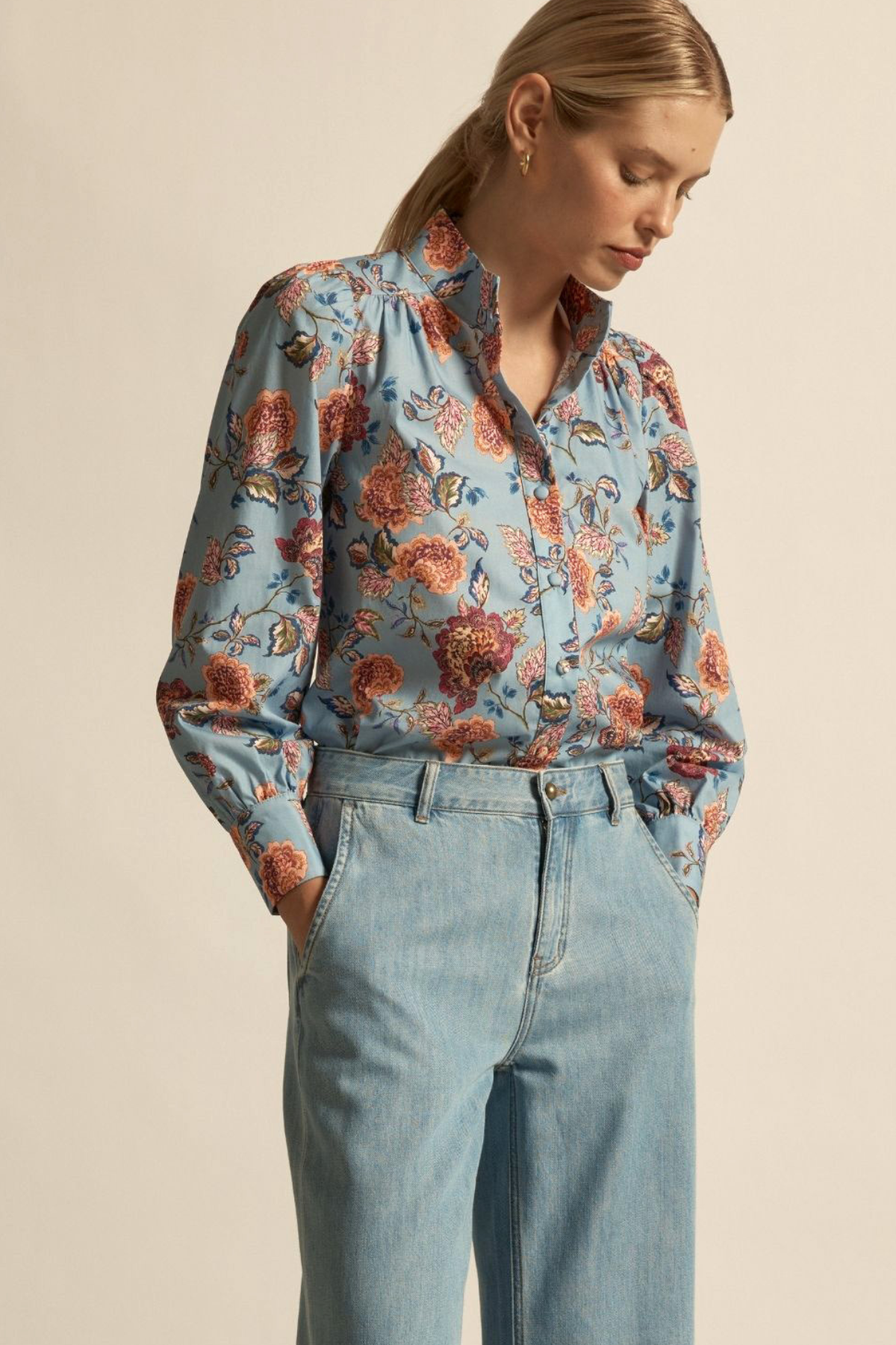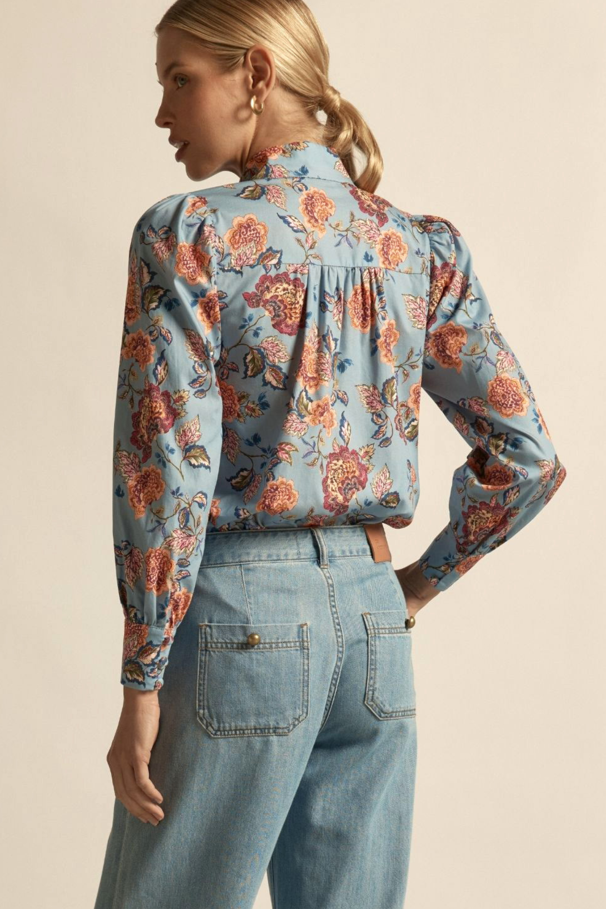 Subtle gathers flowing from the sleeve into the yoke for soft shape