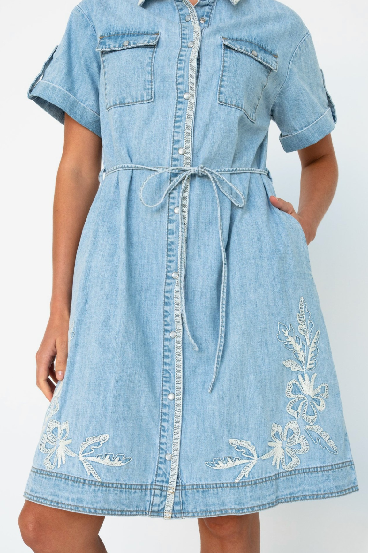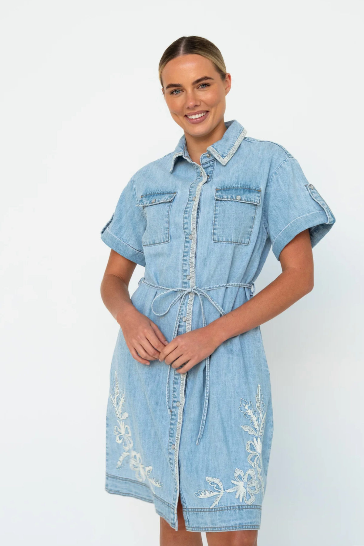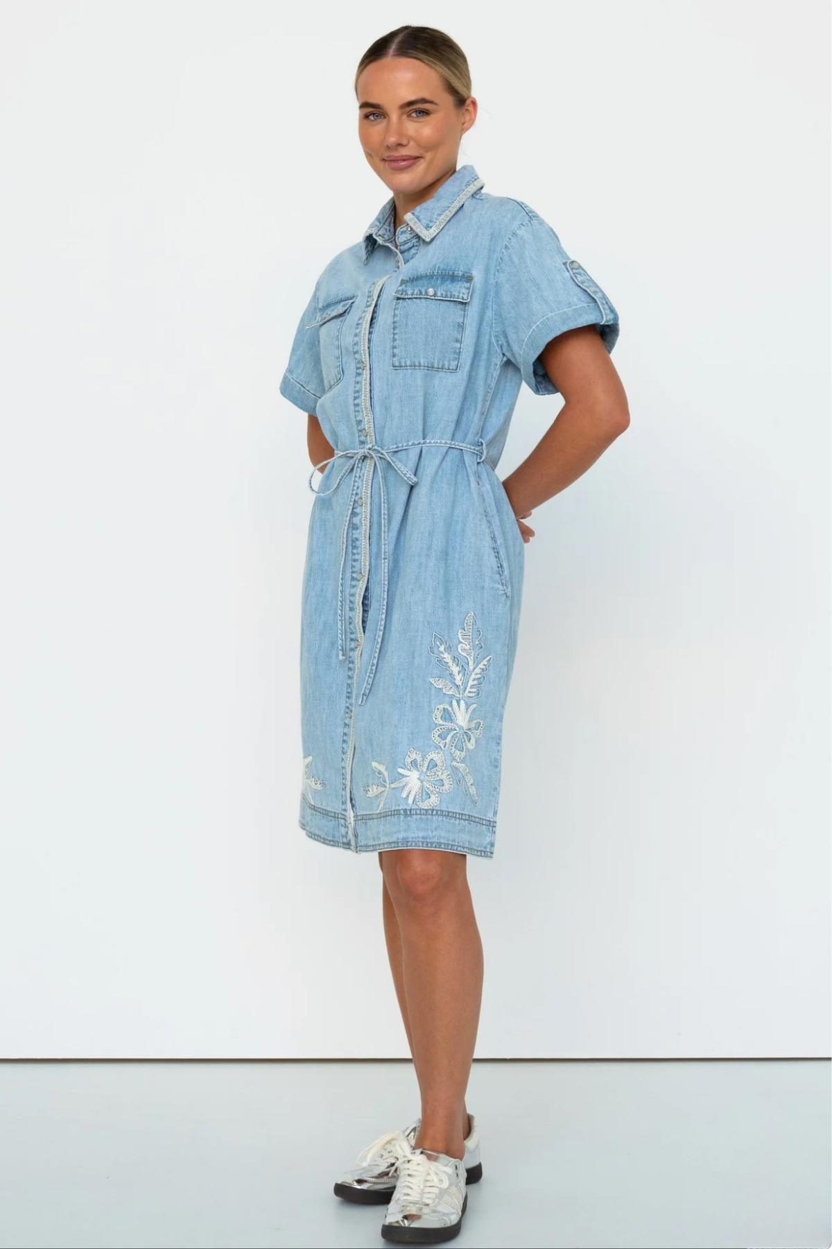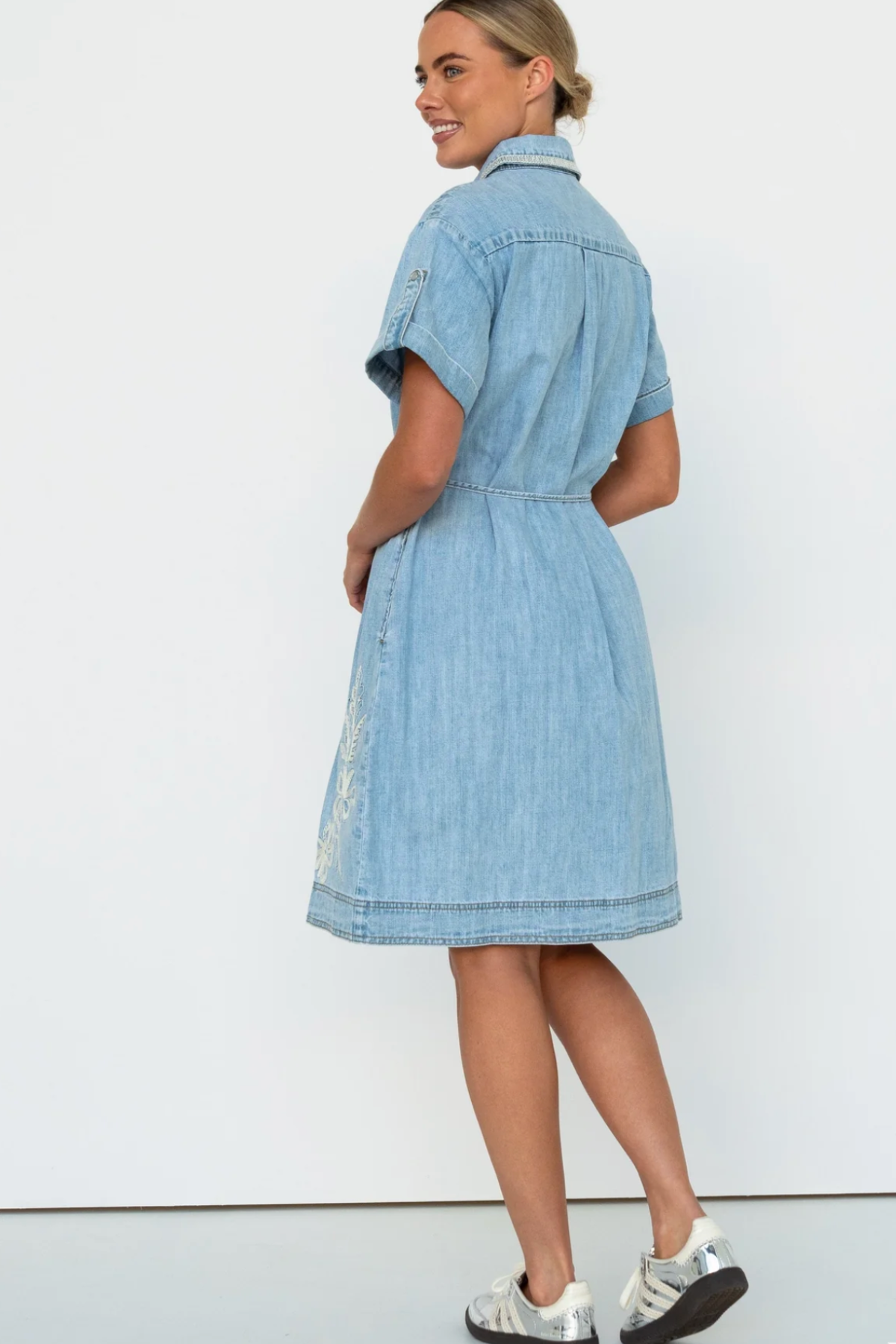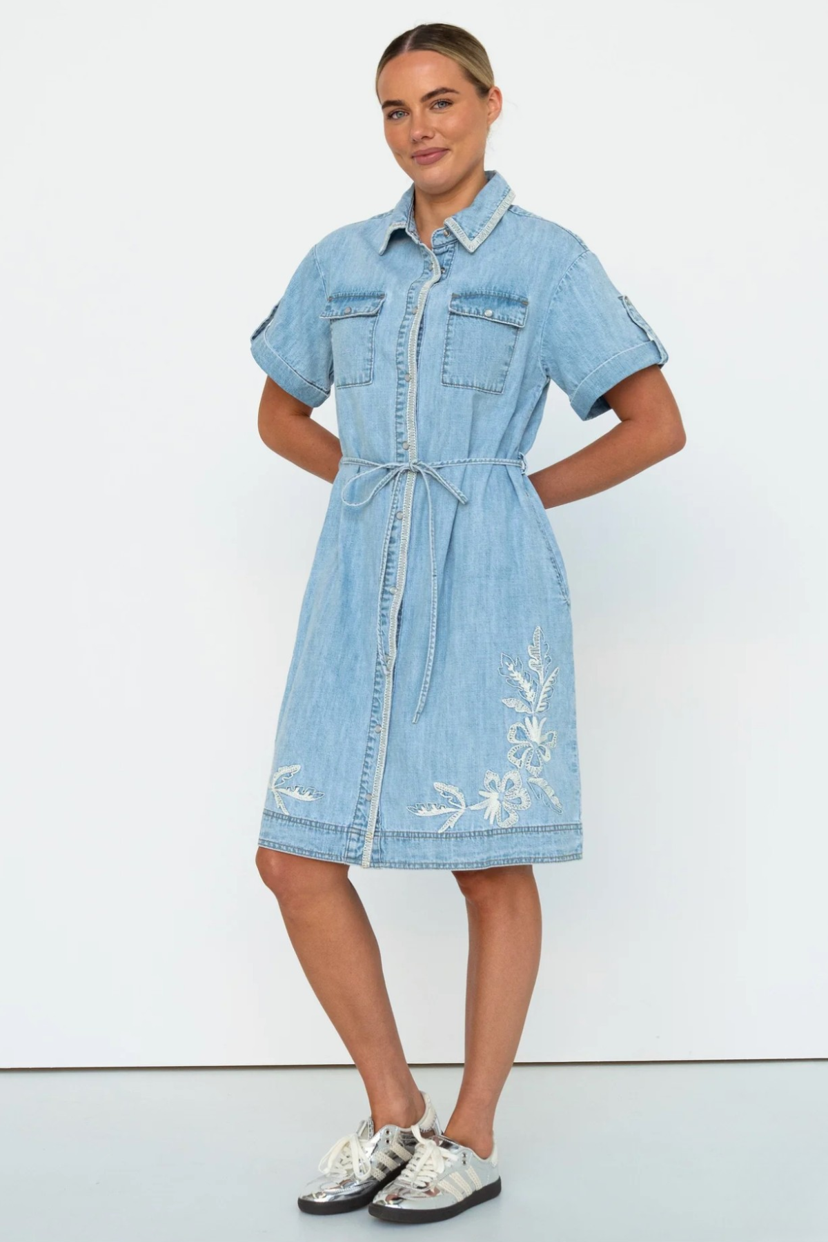 The Simone Dress is the easy mini shirtdress with a cool twist. Designed with patch utility pockets, a button-through front, and a charming embroidered heart detail, it’s a one-and-done style that’s perfect for everyday wear. Pair it with sneakers for a relaxed, casual vibe or dress it up with ankle boots for a touch of city chic.